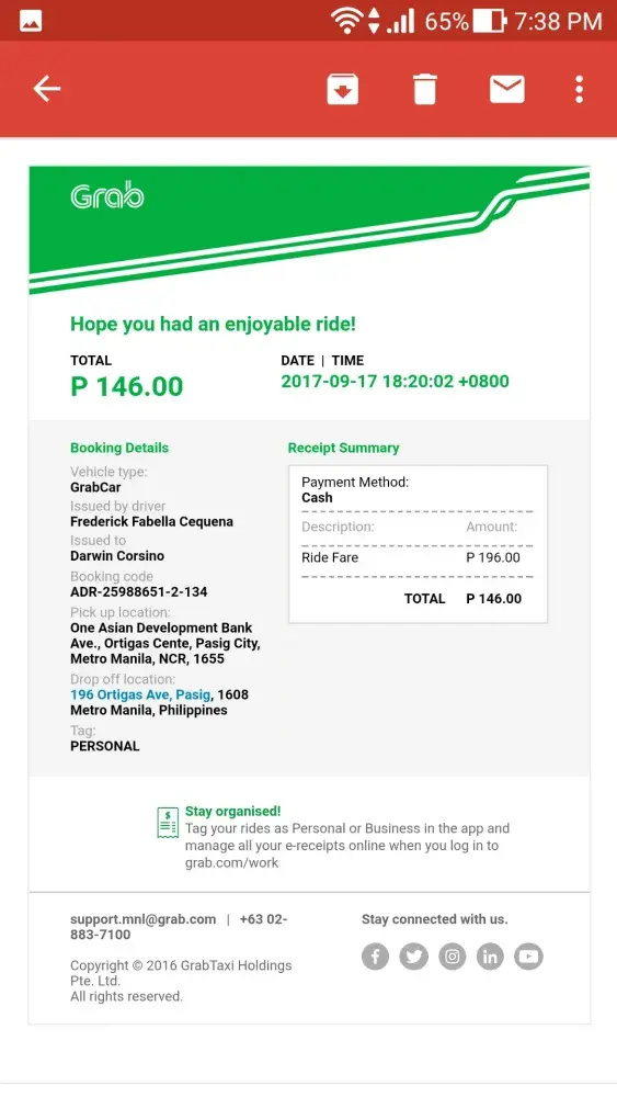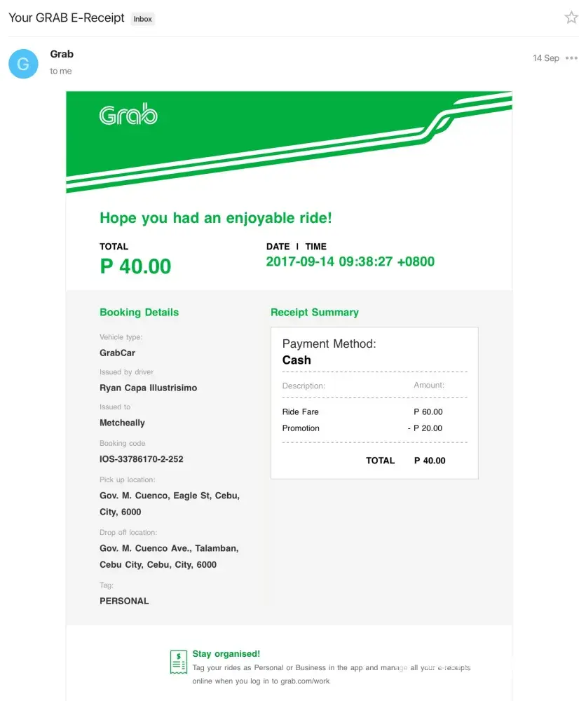 I'm a consistent grab user especially going to school. I did book just this morning September 14, 2017 around 9:30 in the morning. I used the promo code CEB400 so expected to have less 20Php. Everything was going fine except when I handed over my payment and he said he doesn't have any change and expected change that I should recieve is 60Php since i gave him 100Php and the amount that I sould pay was only 40Php. Turns out the driver, Ryan Capa Illustrisimo only has 33 pesos for a change so the solution was I accepted the 33Php because I had no choice and ended up paying 77Php in total just because "he had no change".