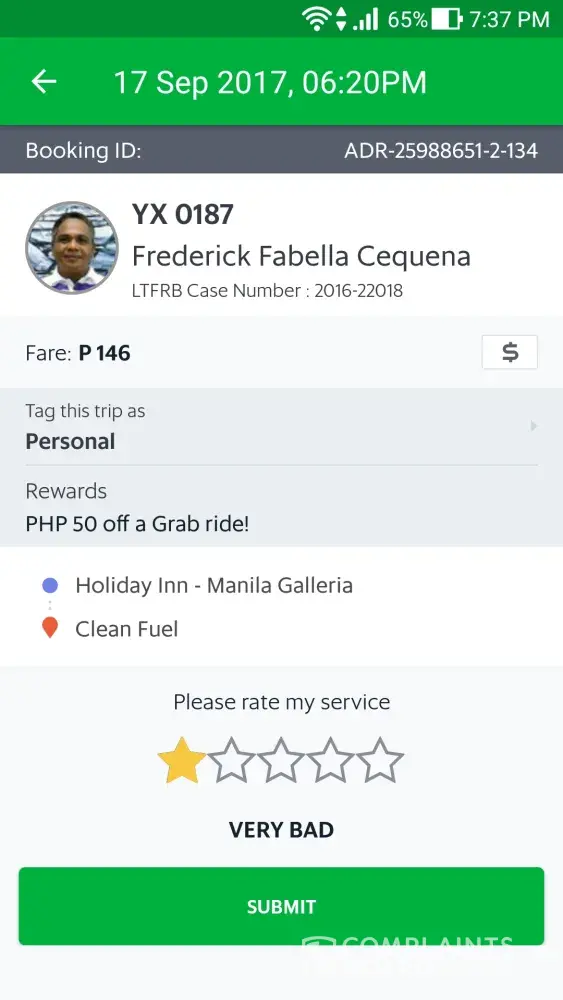 I booked a grabcar for my friend using grabpay with a P50off. I gave him a 5-star rating thinking that the trip went well But when I talked to my friend after, he said that the driver was complaining the whole time about how far the place is and was asking for cash instead. He also didnt dropped my friend off at the exact place and acted 'padabog'. I was so ashamed to my friend because I want to help him take a more convenient trip because he's carrying a lot of stuff. So frustrating and embarassing. I want my 5 stars back and he should not be driving if he cant respect his passengers.