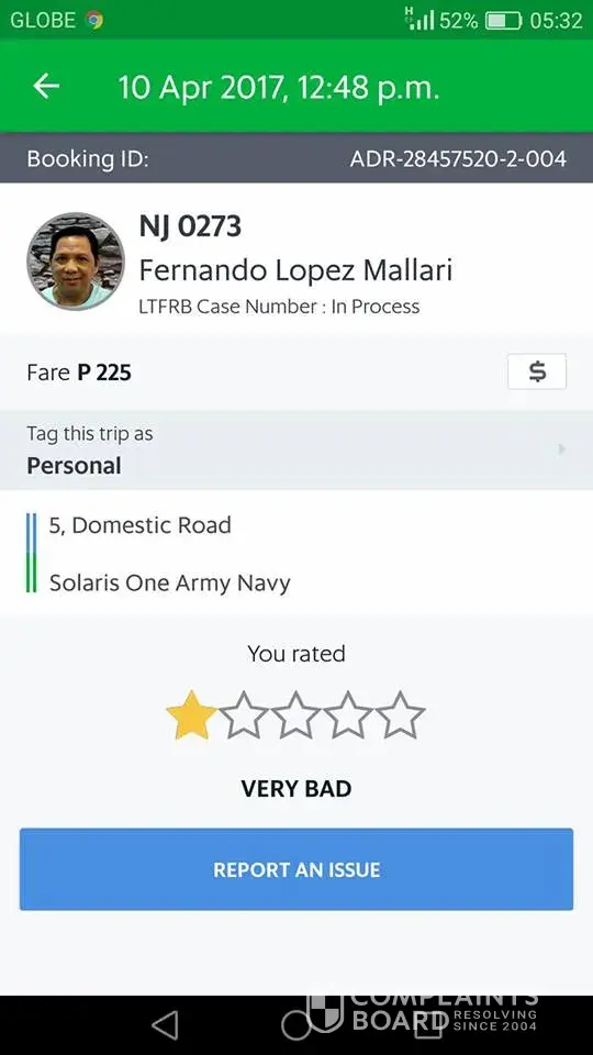 On 3 March 2017 at about 7:00 AM, I booked a ride on Grab, the driver is Edward Cruz De Guzman, the booking code is IOS-[protected]-2-027. My destination is at NAIA terminal 3, my booking fare is Php 414, as I arrived at NAIA, I handed Mr. De Guzman Php 500.00, he told me that he has no change for the said sum because I was his first passenger for the day, because I was pressed for time and I don't want to argue anymore with the driver, I let go of my change.