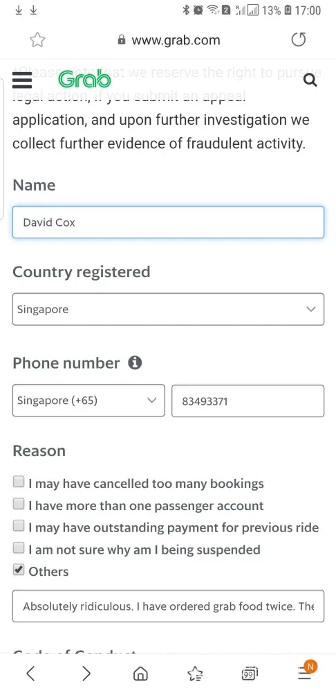 File a complaint against a customer service from grab
