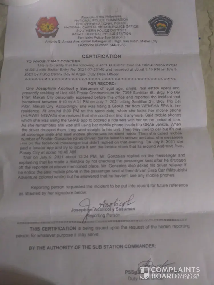 I booked a ride on July 7, 2021 from Wensha Pasay, the driver Mr. Froilan Gonzales pick us up at 8:10pm & we arrived in Santillan Praise Condominium at 8:31 we were 3pax my son was seated Infront & I seated at the back together w/ his GF, during our ride I collected the money the they owe me so, I used my phone Huawei nova3i calculator . I also grab my wallet from the deepest part of my bag so, I can put the cash . Then we arrived went straight to our unit . I was sleepy from the massage so, I relaxed for awhile before I gather my stuff in my bag I was looking for my phone & we found out past 9pm that night we called but out of reach & my Son also tried to locate via my Google acct but we failed.. we are not expert on this because it never happened to us. I panicked, because I have all my bank details, credit cards, photos, documents for work. That phone is my life & my work . As a freelance real estate agent my listing, clients contact is very important. Eventually, I found a way to log-in to my Grab acct then email a complaint on Grab help, Grab said that w/in 12 hrs I must contact the driver to retrieve the item. So, I called the number registered on my grab history, but the driver didn't reply or answer my call. So, we look for him on Facebook & we found to accts. I sent a message in Fb messenger of the driver but he replied on the 9th of July . After I had filed a police report as grab asked me to do & send it to them via email . The driver said that he was sorry, he forgot to check the back seat because he got another passenger right away after he dropped us off & he also ask the passenger next to me & his reliever driver no phone was found . I also paid a tracker app to locate my phone it was somewhere in Pasay . Surely, it was now stolen. Because, all 3 of us passengers are just in Makati.