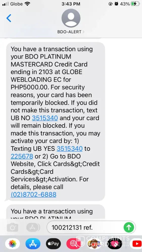 There's someone used my credit card through online transaction. He identified himself as an Operations Manager from BDO. Name was George Alvarez. Not sure if that's also the name on his transaction. I received a BDO Alert and it's from your merchant GRAB amounting to 15, 000 dated November 19, 2021 around 3pm. And I am NOT the one who purchased it. I have NO online transactions made last November 19, 2021. If you receive a transaction using my credit card on the said date please be informed that IT WAS A FRAUD.