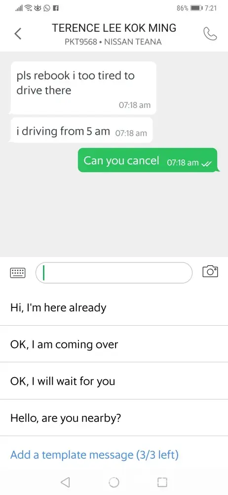 ambut Dalam To KLIA 2) was cancelled by your drivers. They gave me lame excuses. They asked me to rebook and waiting for me to cancel ( to prevent get penalty from Grab) I insisted that they must cancel.. They cancel my booking more than 5 minutes.. This is waste of my time. This act are irresponsible & unacceptable..
