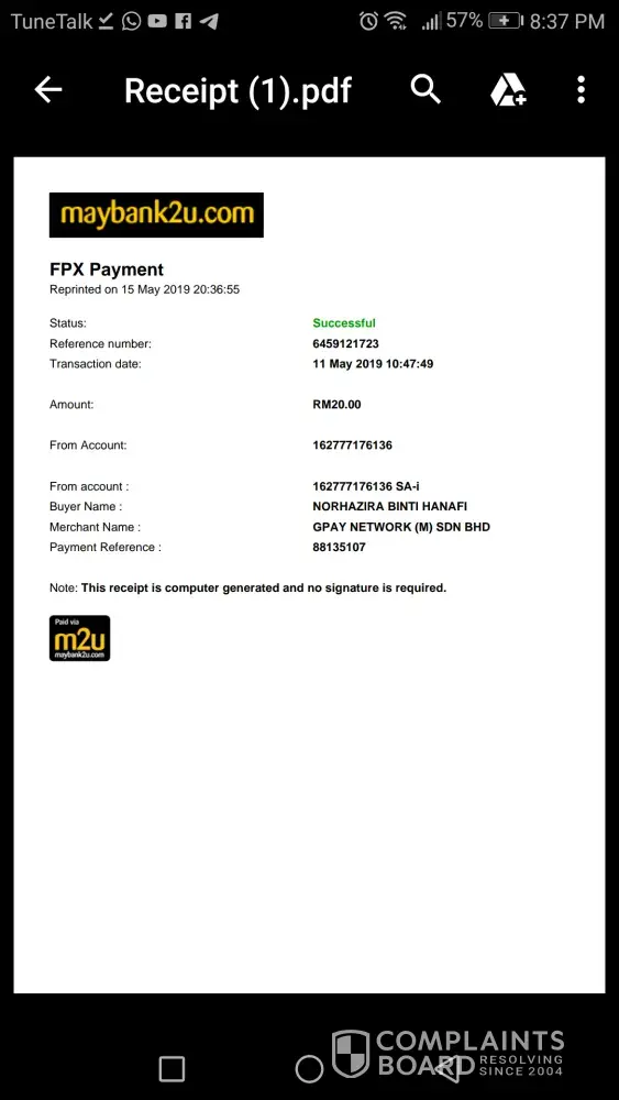 Saya sebagai penumpang atas nama NORHAZIRA BINTI HANAFI No fone [protected] telah membuat payment online (maybank2u) ke akaun grabcar pada 11/5/2019 sebanyak RM20 tapi tidak masuk dalam akaun grabcar saya