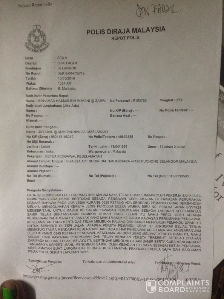 Hi, I would like to lodge a report on this driver because he acted so irresponsibly by punching one of my security guard. I've attached the report for your review. I need the grab company to take severe action on this grab Driver.