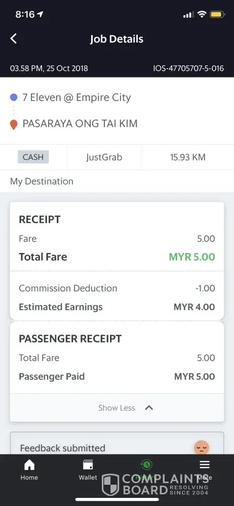 Today, 17/10/2018, I had ordered a grabcar service using the GrabPay Cashless method from Kota Tinggi to Aeon Tebrau but this driver insists me to pay more although I had paid through my debit card via . He told me that I only paid half but then again I had paid using the cashless method by that means my account had been deducted. Please review my issue immediately.