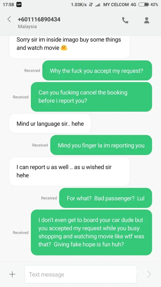 So I requested a grabcar, the name mentioned above accepted and after few minutes I received his message saying He wanted to go shopping and watching movie instead. Then He disappeared for a few minutes without cancelling my request which really pissed me off because it's time wasting. After he replied I felt threaten by him as he said he can report me as well. After that, he cancelled the request and few minutes after that I saw his car pass by me, which made me felt like I was scammed by him because he said he's inside the shopping mall. I hope that GRABCAR can derank or suspend him for his personalities and I demand a repay for my time wasted.