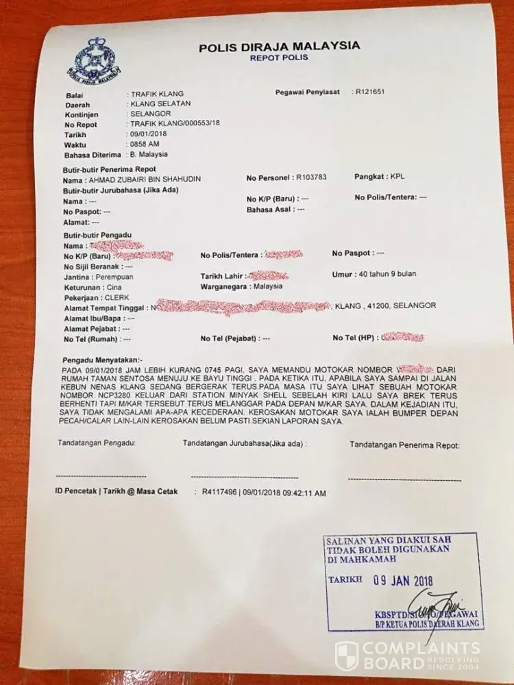 I was on the way to my office in bayu tinggi and stop in jln kebun nenas klang as the traffic light is on red. and this grab car driver out from shell petrol station, he didn't look at my direction and just drive out and hit to my car even though I already horn few times to warm him. to avoid caused the traffic jam at there, I make a move when the traffic light turn green and u-turn to meet him. I saw him came down from his car and check his own car. his car still good and he already saw me but he quickly got into his car and drive off. I was shocked how can he just go off like this and don't even bother to talk with me how to settle. anyhow I went to make a police report and please find the attachment is the police report. I hope your good company will consider to stop this driver because of his irresponsible attitude.
