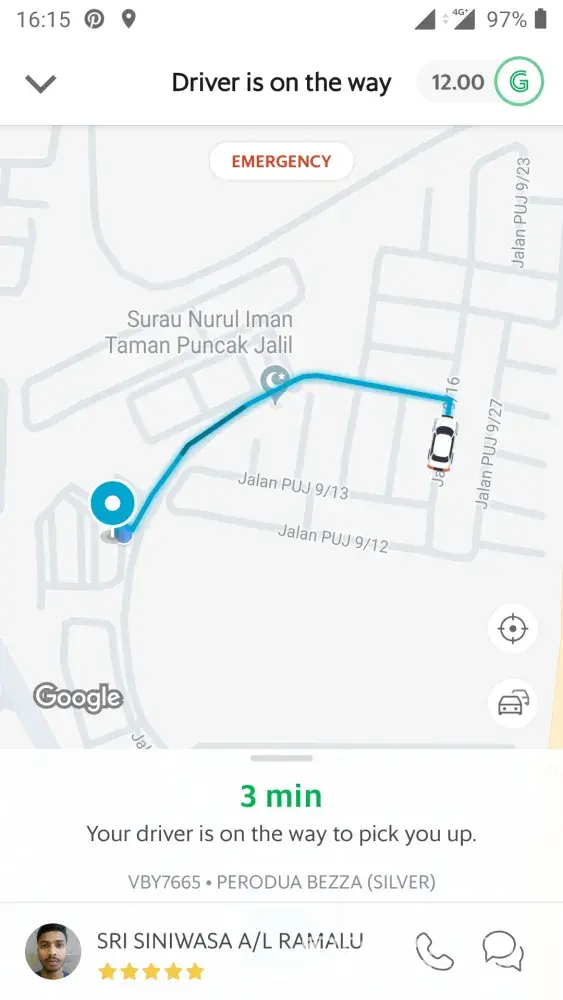 This man Mr. Sri Siniwasa A/L Ramalu driving perodua bezza (silver) with plate number VBY7665 is not responding to my request and the screen show it was 3 minutes drive to my place but i have been waited for 15 minutes. He claimed he was stuck in jam but to my dismay this road doesn't have any traffic light as it is around housing area. I already pay using my grabpay with amount Rm10, it was deducted already. Do entitled to get my money back as this is not my fault and its raining here, i am in rush.