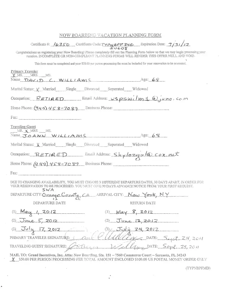 We applied for Now Boarding airline tickets at $50 each. The tickets were offered as an incentive to attend a Vacation Club presentation, which we did. We were required to submit 3 separate travel dates within highly restrictive parameters, a postal money order, and copies of our drivers licenses. We met all time limits and submission requirements. We received the attached rejection letter stating that our registration form was incomplete and that our certificate had been invalidated. The only items not filled in on the form were "Business Phone" (we are both retired) and "Fax" (we do not have a fax machine). Attached are copies of our registration form and the Now Boarding flyer (Item 2. There was no legitimate reason to invalidate our certificate.