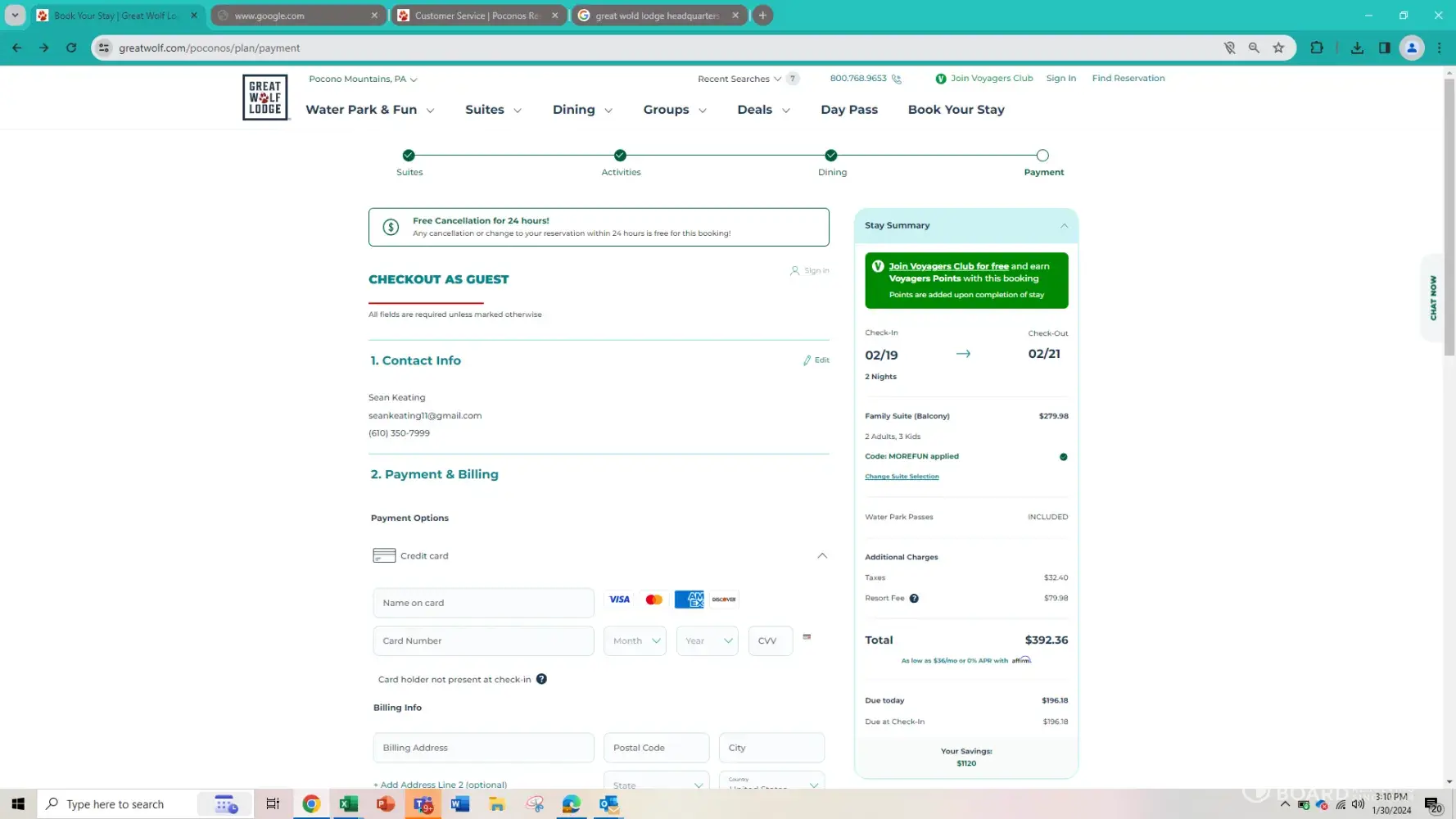 I went to book a stay at Great Wolf Lodge for this upcoming Month. I wanted to stay from 2/19-2/21. I went in picked the dates picked out my room and my total came to be $392.36. I then checked my confirmation email and was charged $850.16 This was extremely misleading. I called the location, and they went on about how you have to book 90 days our to receive that price. They then realized that was incorrect and they said that the price shouldn't be that and that their prices fluctuate and could have fluctuated by the time I ordered to the time it checked me out. All of this made no sense to me. The fact is that it is extremely misleading. I took a screen shot because I was able to generate the price again. William, the associate at GWL, told me there was nothing he could do and that I could either cancel or book at the $850.16 price. This just really bums me out that I go book the site tells me a price then over double charges me. It doesn’t seem right to me that my check out price would be $392.36 and then switch once I booked. It doesn’t seem like something a company like Great Wolf Lodge would do because prices fluctuate. Then to have no solution after taking an hour of my time. This just is not right. Please see attachments of my screen shots.