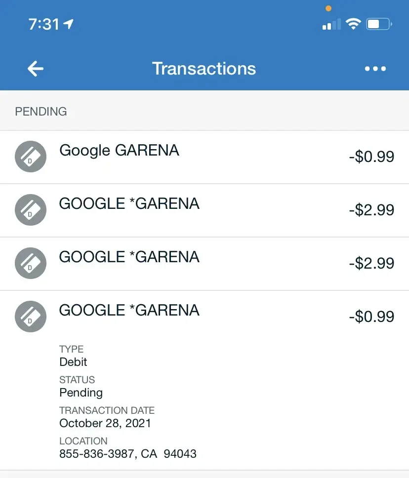 Several unauthorized transactions was ripped out of my card until I had nothing left starting oct. 27th. Some app called google "garena" never heard of it, never downloaded it, and I haven't even USED google since August, using an iPhone now. Wait times on the call service are 100+ mins., that keep going up in-call. Never answering. I'm very poor, can't get access to a bank/checking account, and now I just want my card cancelled. Please help.