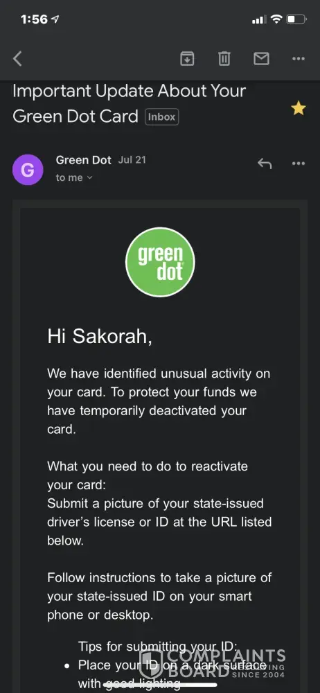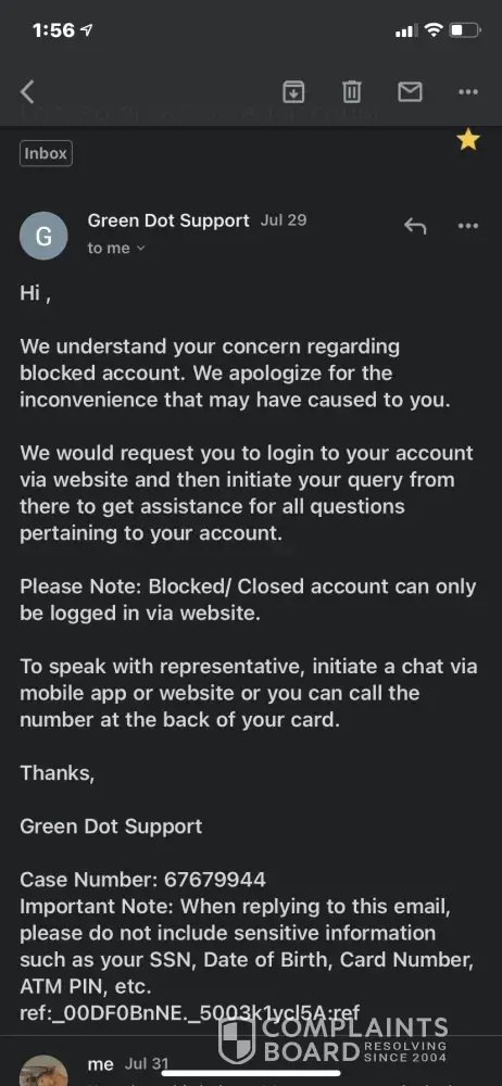 I'm so stressed because I commute to and from work and will have to be onsite next week. So not only will I be without my vehicle but me paying rent on time and probably charged a late fee. I went ahead and filed a BBB complaint and following up with the Federal Reserve on Monday. I also filed another complaint with ConsumerFraudLegalServices but also contact my attorneys office. This is disgusting and my gut feeling is telling me that the process is going to take more than 2 business days. My concern again is why not send an email back to customer's that the documents has been received and state in the autoreply that it can take up to two business days to receive an answer? It's that simple! Green Dot hire so many foreign people that it's sometimes hard to understand what they're saying over the phone. Thank goodness I recorded my phone calls today as evidence because I'm going to seek legal counsel. Green Dot was never like this in the past, and I did direct deposits with them because I liked the fact that I would receive my money a day or so ahead of time. But to endure this type of headache, anxiety and stress is unwarranted. Now I have to feverishly contact my job on Monday July 26, 2021 to explain the situation and figure out how to stop the direct deposit from coming on July 28, 2021 into my blocked and deactivated account. The sad part is that without customers Green Dot would not be in business. When companies starts to abuse the privileges it's given that hurts the same consumers that keeps them in business is when it really becomes an issue. Hopefully the Federal Reserve will be able to guide me on what else I need to do in this matter on Monday 26, 2021! I need my funds released to me asap, my account reactivated and for the nonsense to be resolved asap!