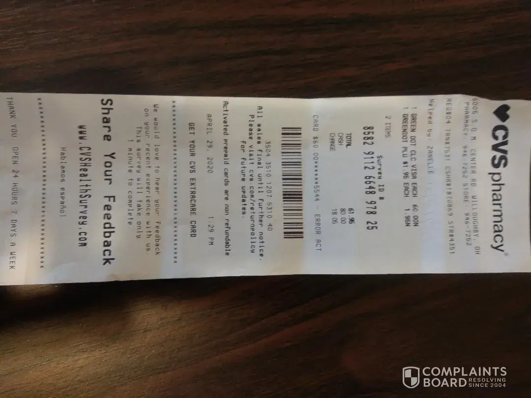 I did call CVS but they told me to call green dot. com. and Here I am enclosed all the documents. This was a mother Day gift to my mother.