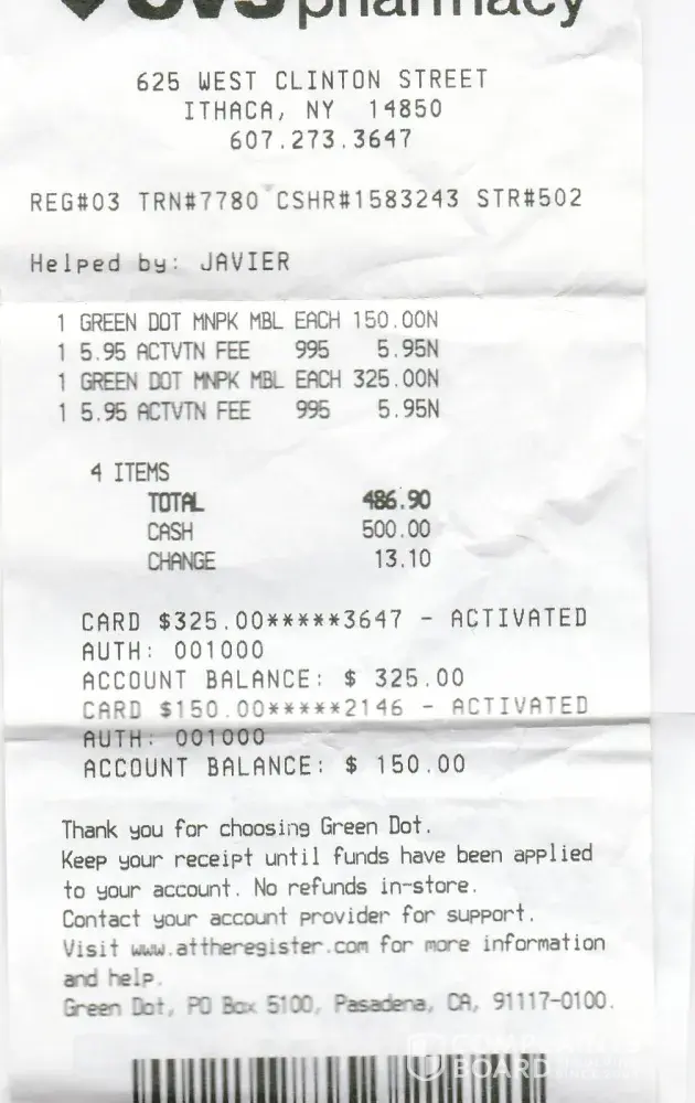 I was the victim of a telephone scam. On 12/21/17 I received a call, telling me there was a warrant for my arrest, and that I needed to purchase two Green Dot Money Pak cards for my bail.The scammers insisted, that the cards must be purchased from CVS pharmacy, 625 West Clinton St., Ithaca, NY 14850. Both cards were purchased on 12/21/17, Green Dot card # [protected], for $150.00, and Green Dot card#[protected], for $325.00. The first card for $150.00 was cashed by the scammers, however, the second card, for $325.00 was flagged as invalid and the funds never received by the scammers. The scam perpetrators remained on the phone with me, until I purchased the cards. They insisted on me giving them the card numbers, once they had the numbers, they directed me to go to the Tompkins County Sheriffs Department, to surrender myself. Upon arrival to the sheriffs, we discovered that I was scammed, as they had no warrant for my arrest. I filed a sheriff's report, with Deputy Sheriff, Kyle Davenport, C&R # S17-13938. My wife reported one of the cards on your website, before we left the sheriffs dept. Later that night I received another call from the scammers, asking me to repeat one of the card numbers, as it had come back as invalid. This was the card my wife had reported before we left the sheriffs office. I have tried numerous times to have the $325.00 returned to me, with no luck. I have attempted to call Green Dot Company and when I tried to apply for a refund, I received a message that my card was not valid. I have not been successful in talking to a company representative, as their automated phone service does not allow it. I am disabled and live on Social Security, $325.00 is a lot of money to me, I am sure the money is still on this card, but at a loss on how to recover these funds. I am attaching a copy of my receipt. Please can you help me find a way to contact Green Dot, and speak with someone who can help me to recover the $325.00?