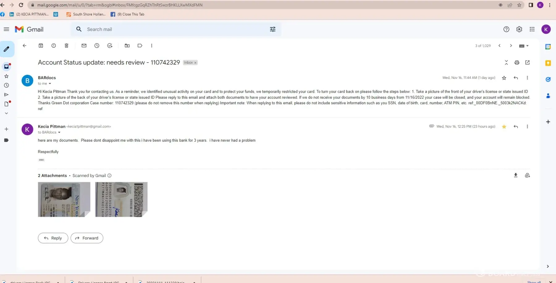 Hi Kecia Pittman Thank you for contacting us. As a reminder, we identified unusual activity on your card and to protect your funds, we temporarily restricted your card. To turn your card back on please follow the steps below: 1. Take a picture of the front of your driver's license or state issued ID 2. Take a picture of the back of your driver's license or state issued ID Please reply to this email and attach both documents to have your account reviewed. If we do not receive your documents by 10 business days from 11/16/2022 your case will be closed, and your account will remain blocked. Thanks Green Dot corporation Case number: [protected], 11:44 am