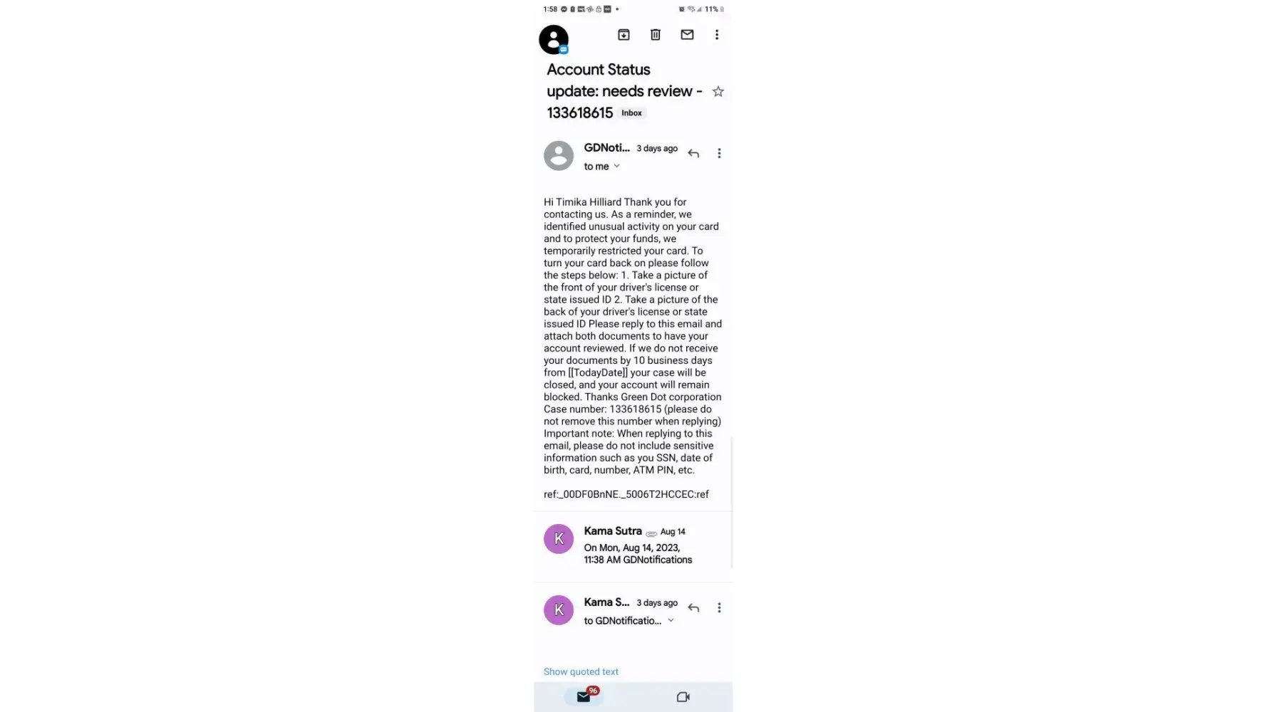 On June 1, 2023 I had my back pay directly deposited into my green dot account, in the amount of 47,000 before I even had a chance to withdrawal anything it was permanently locked. I called green dot where I sent in my ID card and they said they won't accept it as it was a permanent resident card they needed a state ID or Driver's license so I had to go to DNV and get one, after I did that I have mailed in my ID over 10-15x and they keep telling me they are waiting for review. So it's been almost 2 months and my account is still locked I get absolutely no where when I call just the same thing over and over again that it's under review it will be unlocked ked in 2 days I'm told this over and over again, I don't know what to do any advice would be greatly appreciated.