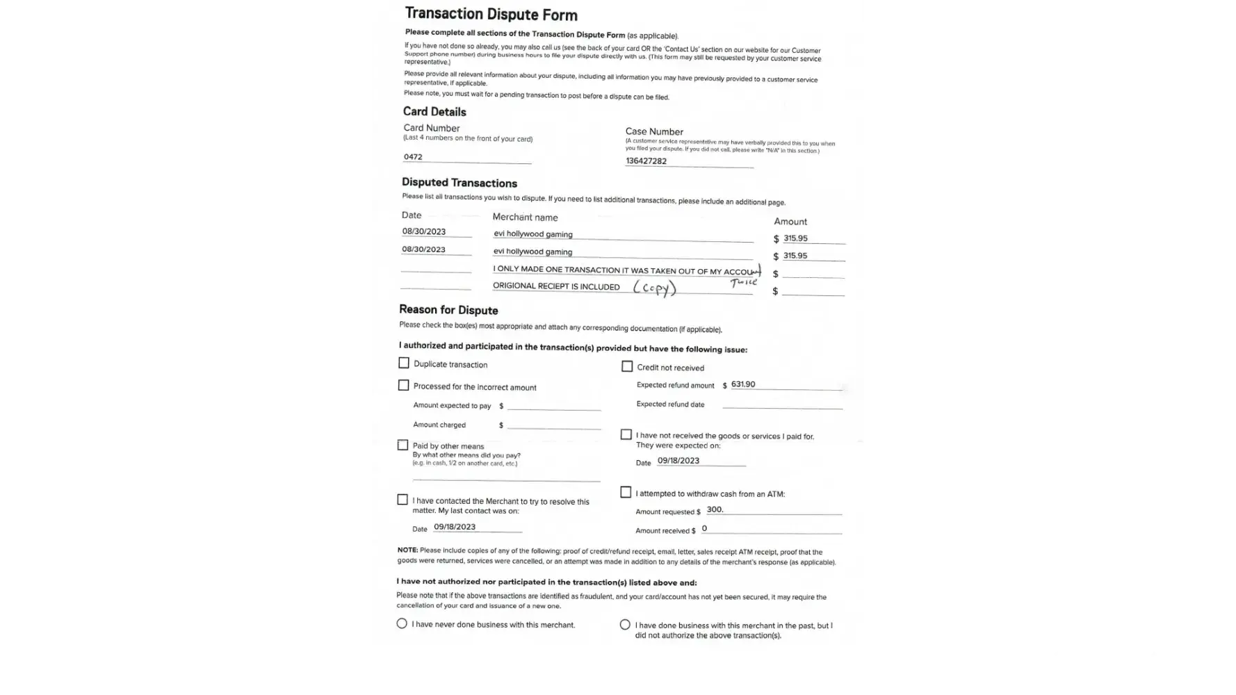on august 30 2023 i made a atm cash advance transaction at at local casino, the transaction went through the atm machine fine and the atm printed the receipt . this is to be taken to the cashier to be paid in cash.