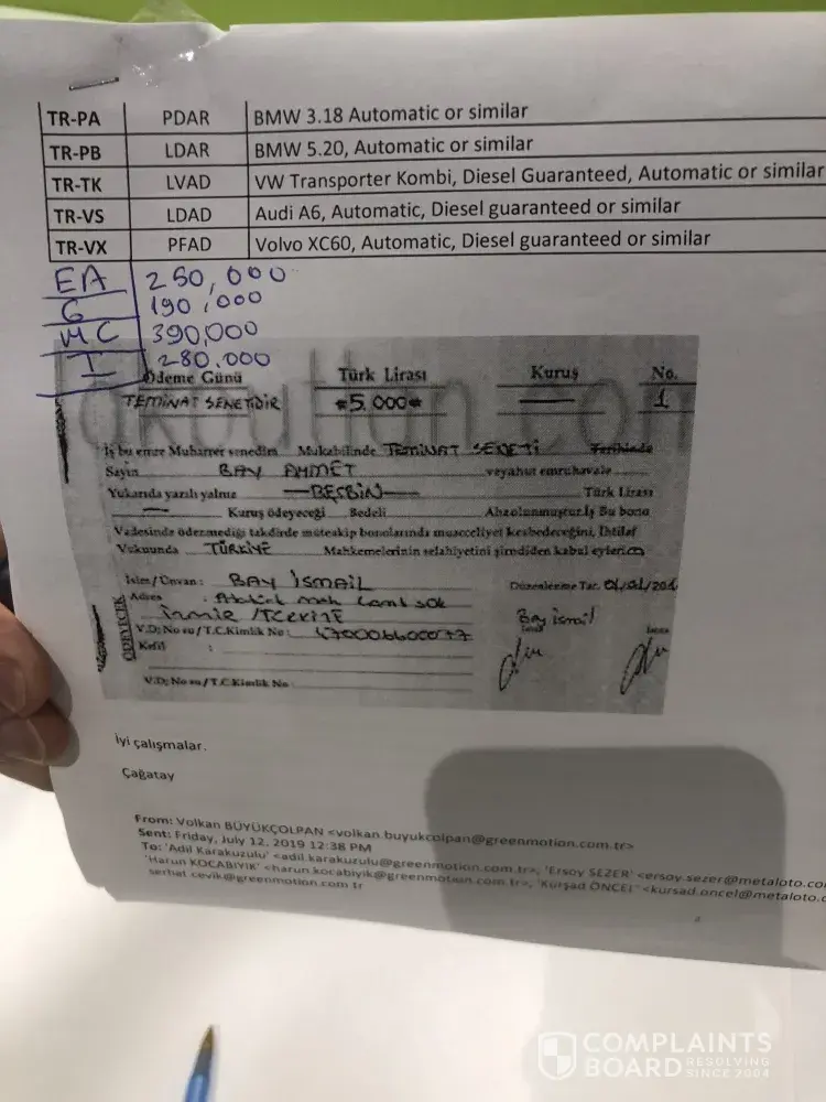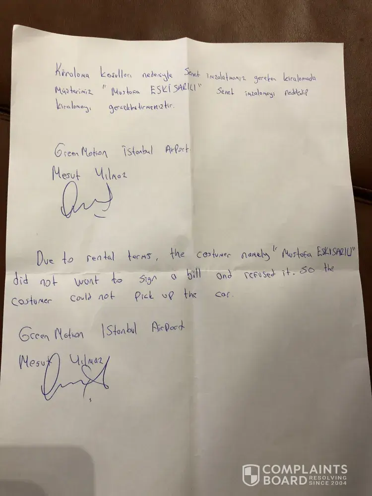 Green motion/ Istanbul airport company ask me to sign some additional bill (Turkish style credit check which is very unprofessional) . Never faced a similar matter before. And they told me that they requested it from Turkish citizens. I did not agree with them and did not get the car. Unclear request. Please return my money back.Booking no CF2E7874