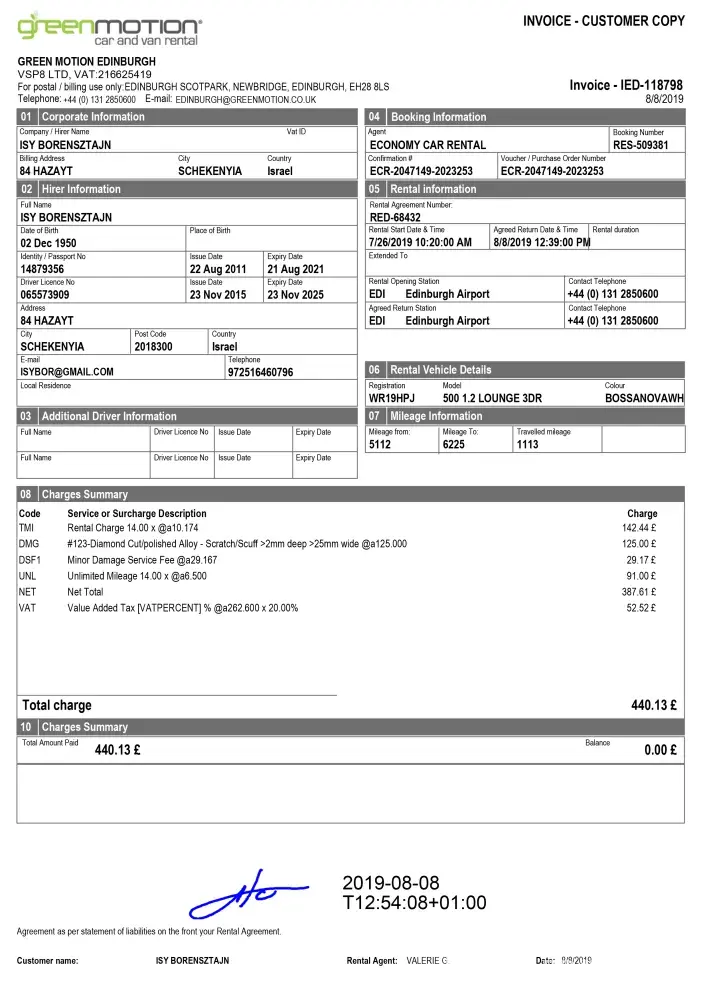 We rented our car from "Green Motion" at Edinburgh Airport in 23rd July and returned it in the 8th August.