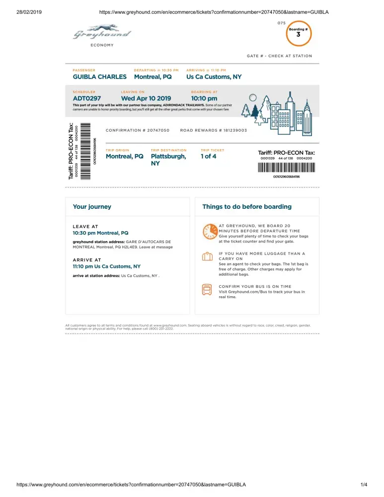 I am contacting you to make the following point regarding my trip with Greyhound on Monday, April 22, 2019. I bought a Plattsburgh, NY ticket in Montreal, Canada. The departure was scheduled for 3:30 pm. From 3 pm, I was at the bus stop. The bus never showed up. When it was about 4:30 pm, with a passenger who was in the same situation as me, we asked the person at the counter to see where the bus was. It was then that after doing some research online, she said that the bus was at the border. As a result, the driver did not stop at the place where he was scheduled to stop, especially since we had been waiting for the bus outside from 3:00 pm to 5:00 pm.