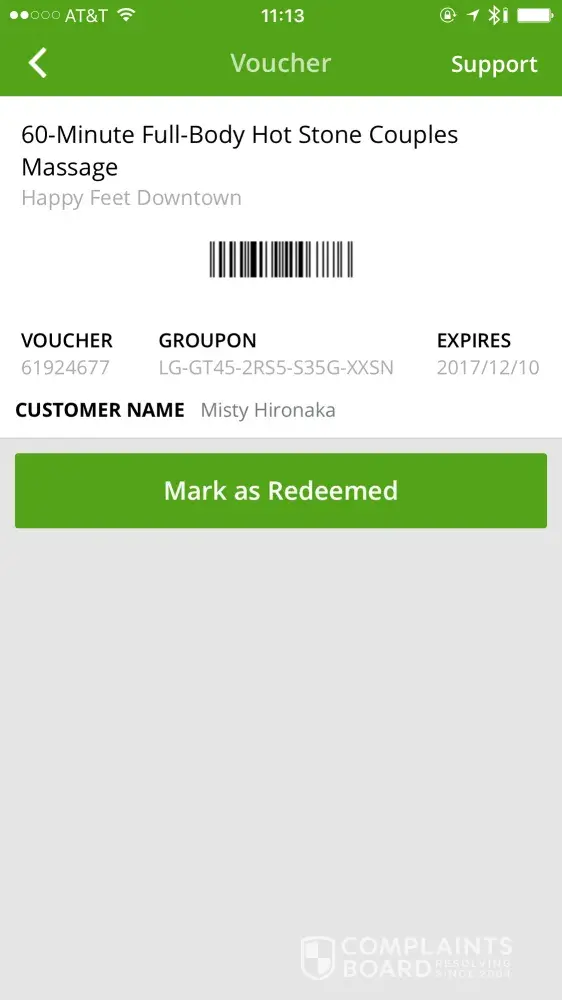 Purchased a Groupon for couples massage at Happy Feet downtown Las Vegas. As listed on instructions, I made an appointment in advance for noon today. We arrived on time and checked in...when the attendant scanned my Groupon, she said it had already been redeemed. It was the first time we walked into the door and I tried to explain this and that we were from out of town. She said "no massage" English was obviously 2d language and showed me her cell phone which displayed redeemed in red. She handed me her bosses card to call back. Obviously upset because I feel I was ripped off, we left.