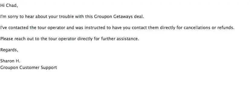 Hello, We tried to purchase a groupon for a peru tour trip through gate 1 on Oct. 10 2017. The transaction came back declined. We then tried a second time, again it said declined. I checked my account and then tried a third time where the groupon was successfully processed. Because we needed 2 vouchers for this trip we then tried to book a second voucher, so our 4th groupon try...and it came back declined. So we cancelled our only voucher and we were refunded. Then we went onto my husbands groupon account and we successfully booked and redeemed 2 vouchers. The next day we noticed on our visa that all 3 of the declined groupons went through at a later time. This is completely unacceptable. I have tried for 2 weeks to contact customer support with answers and help and each time they refer me to someone else. The email I received from your outbound team addressed me by the wrong name and said that I needed to contact the hotel to get a refund. This was a tour, not a hotel. And we did contact gate 1 and they said this was 100% groupon error and nothing to do with them. I am appalled at the horrible customer service. Especially with the fact we bought 2 vouchers for this trip with you. We wanted to give groupon the chance to fix this and because you have ignored all my emails, live chats and even a phone call we are going to let visa refund us and get the money back from you. We are now deciding on whether to let visa refund us the money for the trip we actually booked and wanted to go on. I will never use groupon again and will make sure every travel group and everyone I know how unsafe your company is. Especially with booking trips costing a large sum of money. I have had no response back from any email so I am hoping this will at least reach someone who can hopefully at least acknowledge this disappointing situation. In the end it is your company who has lost both payment and customers. I have numerous records on email with all my online chats and emails. I will send the final email I received. Please note after seeing this email I am sending, I am not chad, my name is Sheri. They didn't even address my name properly. Also the lady said they contacted gate 1 and when I called gate 1 they had no record of groupon saying they contacted them. So I feel really shocked she would lie to me also.