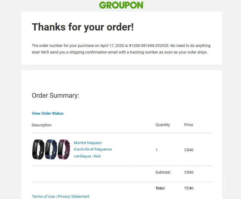 I place an order on groupon.ca on April 17, 2020 for a ID115HR Plus Fitness Tracker 0.96'' OLED Touch Screen with Heart Rate Monitor (Order #[protected]). The cost of order $40.00 charged on my credit card on April 17, 2020. on April 23, I received an email with a tracking#UF120914725YP order is on the way, but not yet received. I checked with CANAD POST but they confirmed that this tracking number may be fake. I contacted groupon.ca several times, but no solution yet. It seems this is organized fraud. So please help me find a solution as soon as possible. I am paying interest to my credit card.