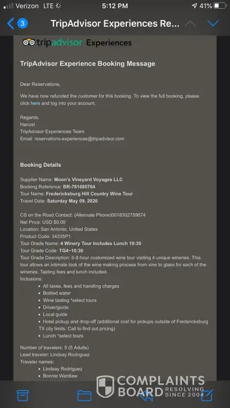 I purchased a Groupon for Moon's Vineyard Voyages for the weekend of May 9th, 2020. Groupon canceled my purchase even though the event was not canceled. I had to rebook the trip via the merchant's website directly to keep our spot. Groupon is only refunding me $993.60 in Groupon Bucks. I provided the emails to Groupon from the merchant showing the event was not canceled and requested a full refund to my credit card. With no success, Brandon from Moon's Vineyard Voyages contacted them directly to resolve the issue on May 6th. See the email below from TripAdvisor with confirmation that I would be receiving a refund. Groupon is still showing Groupon Bucks and my card has not been credited. I have reached out numerous times to Groupon and TripAdvisor and have been unsuccessful. Please provide assistance in issuing a credit card refund for $993.60 since I paid twice for the wine tour.
