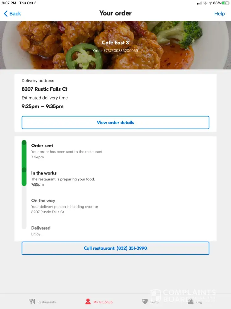 For 3 of the past 4 nights, my wife's cell phone has rung because of grubhub drivers calling to say that the order has been delivered... At 1:00 or 2:00 am... They have woken us from a deep sleep and it takes hours to get back there.