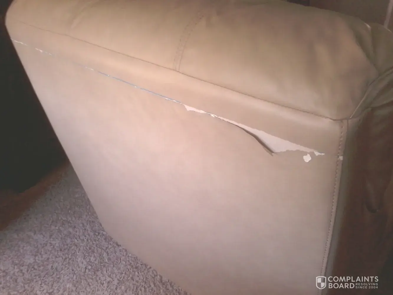 I called the next day to file a claim. I was immediately told the nipple was not covered, which I complained about but it did no good. Finally, three weeks later I received a call for a technician to come out and survey the damage. He spent 15 minutes looking and taking pictures. He told me that he would need to order two new pieces of leather to replace the entire back of each piece. Two weeks later I get a letter denying my claim.