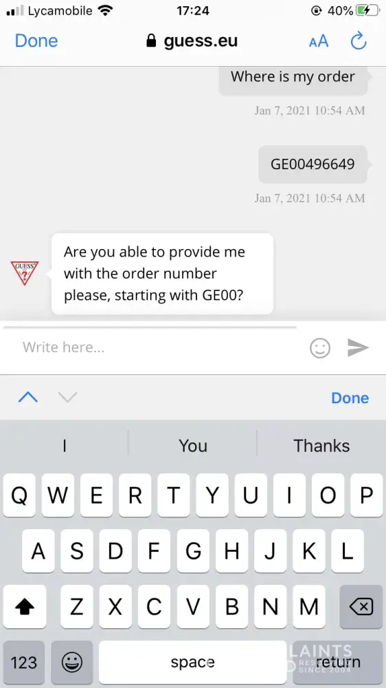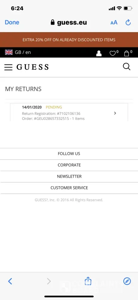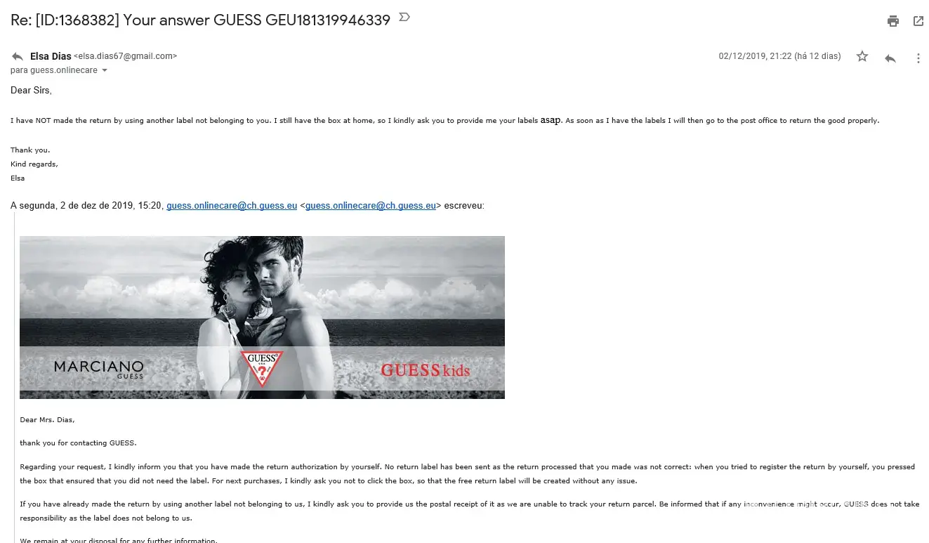 Having this information, I've sent already 3 emails informing that I didn't return the goods and requesting the labels to be able to return the shoes properly. No more answers from Guess.I'm writing to you because I feel I'm being tricked and this kind of behaviour should never be acceptable from a company like Guess - Leaving the Customers without any responses.