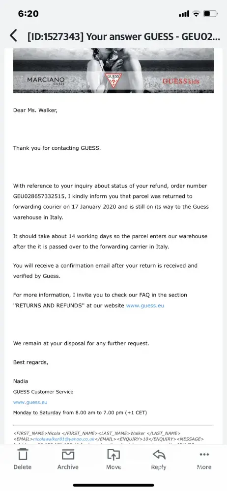 I can't believe that an international company like guess treat the customer so bad... my husband order a dress as a surprise for me and is the worst surprise ever because of guess store. Two weeks ago he order a dress I saw on the mall in Dubai he make it on line as surprise the delivery took more than 2 weeks finally arrive to Dubai first I don't understand how it there is one million stores with guess here in Dubai why u deliver the product from Italy the dress came with e y bad smell plus I have to pay extra taxes the dress was more expensive than buying direct from the store this is no acceptable I call many times customer support in Italy I went to the store in Dubai of guess nobody care and nobody even try to call me back to see what happen everyone keep saying sorry but I wait 2 weeks for the same you charge on the credit card now I have to wait someone to pick up again the dress sent it to Italy wait for my money refund this will take more than 3 weeks why they don't make the customer live easy and just make me collect from the mall is less price is the same a store why I have to wait again worst experience ever