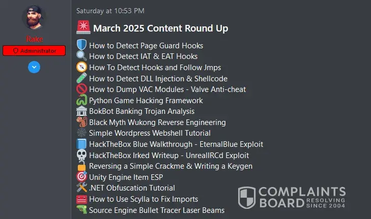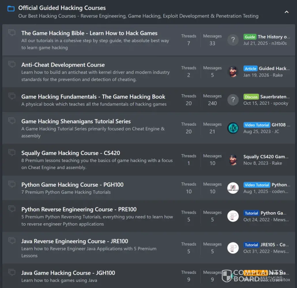 Another great thing about GH is the regular updates to the site. The content never feels stale, as they are constantly releasing new tutorials and updating older ones to keep everything up to date with today's practices. They also provide you with many downloadable tools, which are super helpful. You do not have to worry about accidentally downloading a virus since everything is either tested and checked or made by themselves. Most of the time, the tools are also open-sourced, meaning you can check it or even compile it yourself! You can get started on hands-on projects right away without wasting time searching for resources. Whether you're new or experienced, GH is the right place to be when you are looking for game-hacking learning resources.