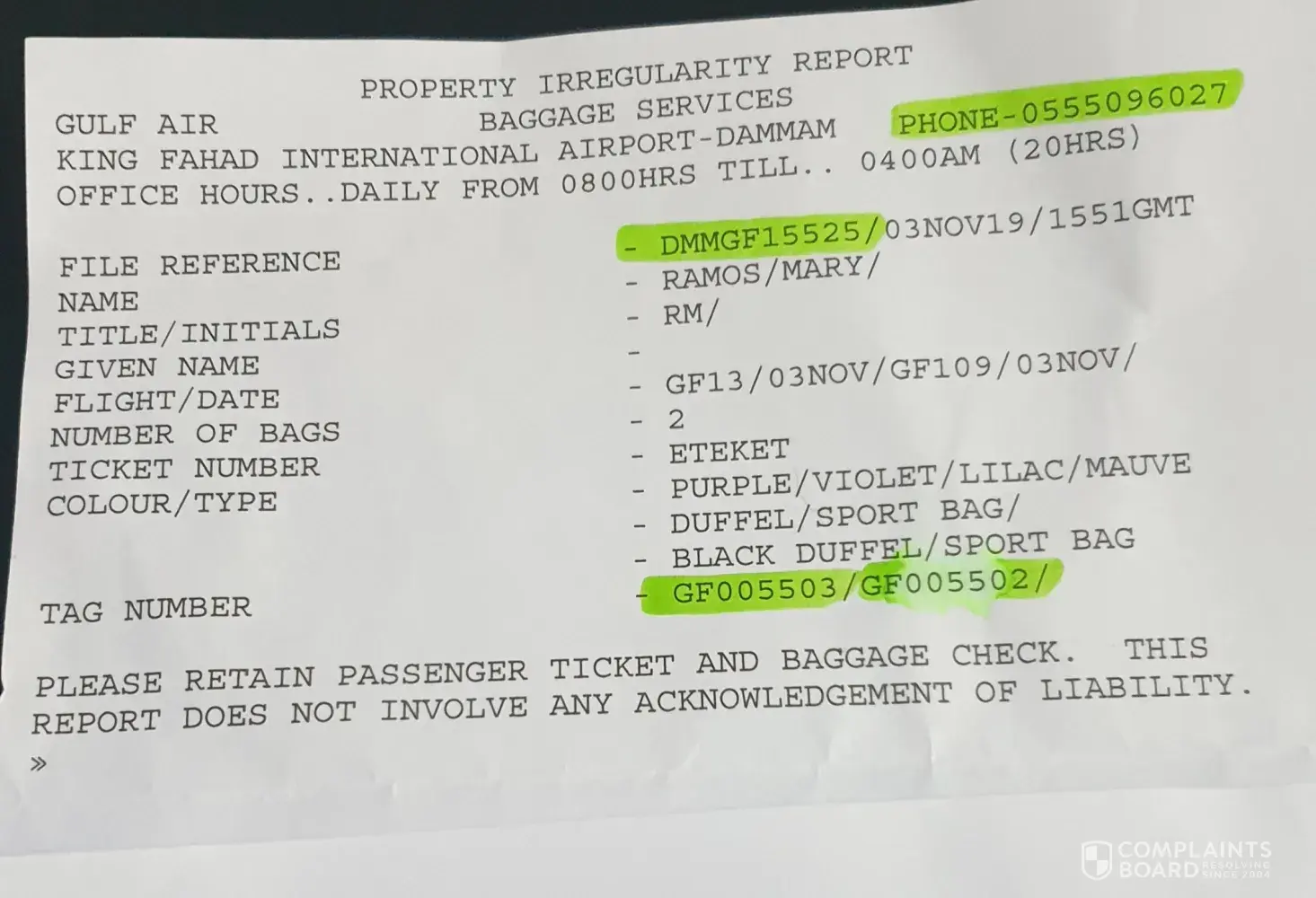 Based on 2 evidence passenger Ramos Mari filled the complaint with the agent of Gulf air (King fahad Intl apt), which issued PIR to the passenger.
