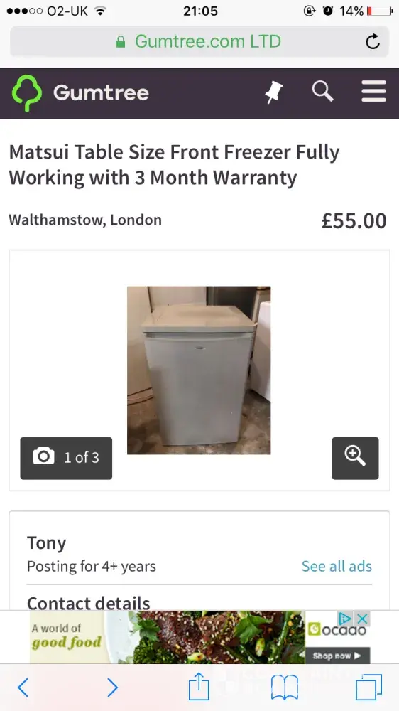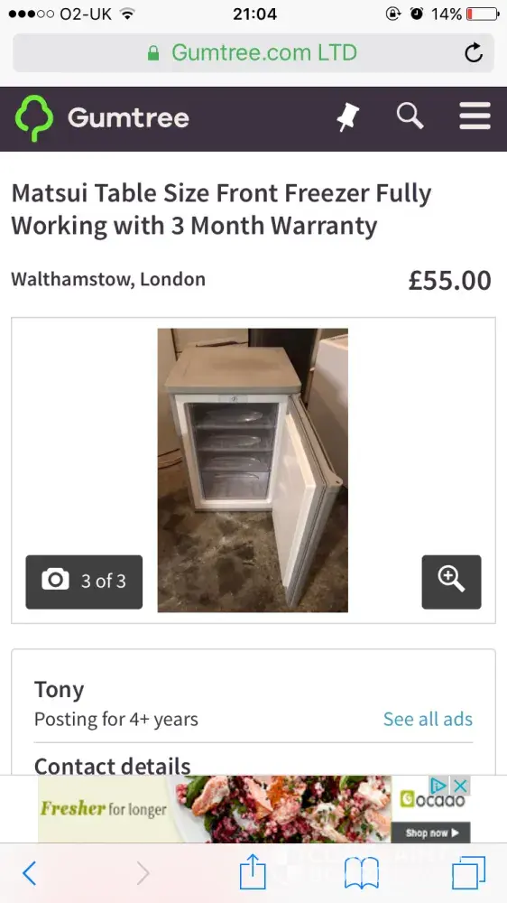 I purchased a fridge freezer from gumtree because the ad stated that there is a three month warranty on it. The freezer stopped working after a month and after liaising with Tony the person I bought it from he said he will send an engineer to fix it after repeated calls he then said he acts broke down, engineer is sick etc but now the number is disconnected and I can't reach him. Is there anyway of gumtree being able to reach him to obtain my £135 back as I have since the. Had to purchase another fridge freezer as all the food was going back. I don't know how to locate him as he delivered the goods so I don't know where his company is located.
