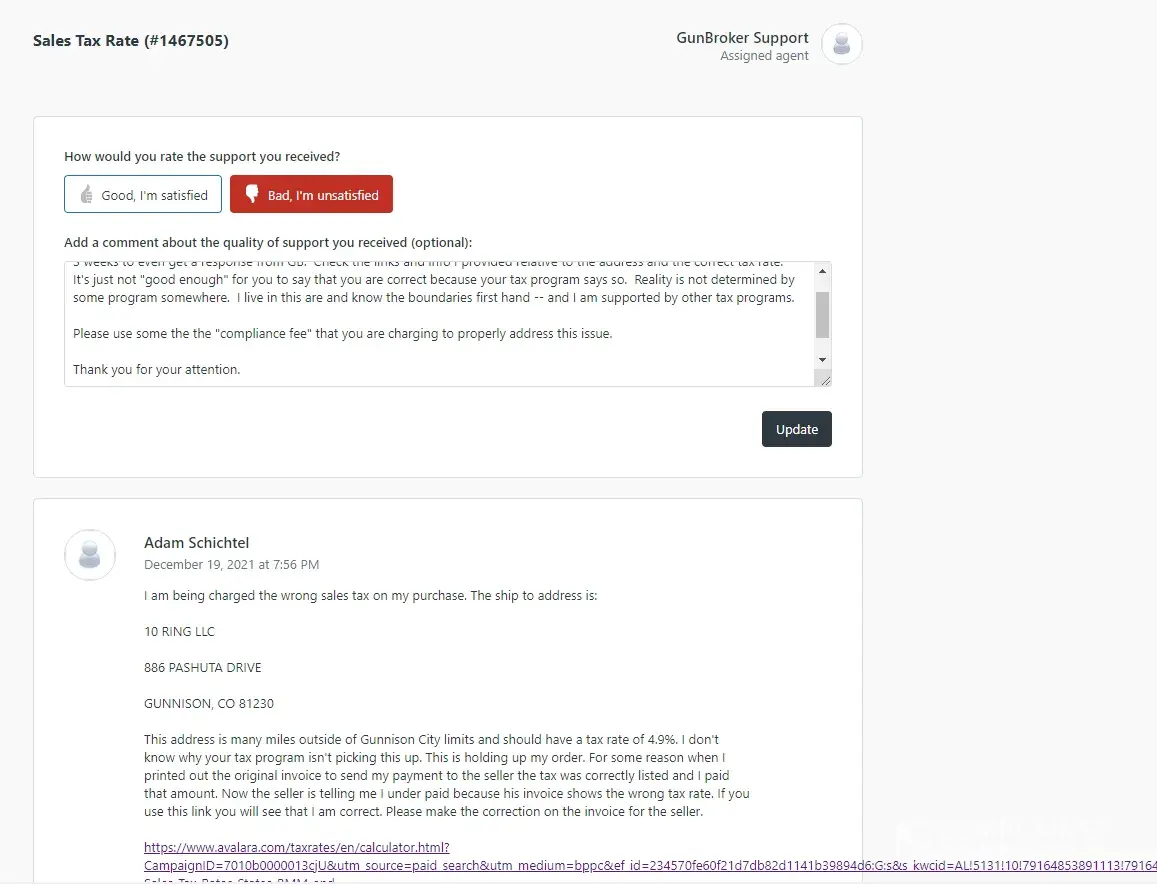 GunBroker overcharged me for sales tax based on the ship to address and refuses to even acknowledge my complaint despite my providing proof.