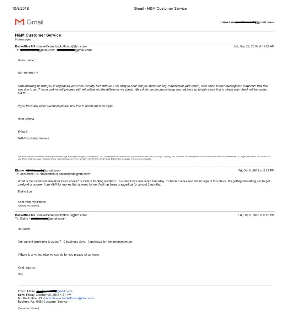 I made an online purchase on 8/11 and returned a few items in the store on 8/22. On 8/23, I only received partial refund in my credit card. H&M emailed me of the error they detected and promised to rectify the situation with my full refund in the form of a check. I have called their customer service on 9/17, 9/24, 9/28 and 10/6. I have yet to receive my check for my full refund. I also have a email conversation exchanged with their backoffice and yet my issue has still been unresolved. I just want what is owed to me.