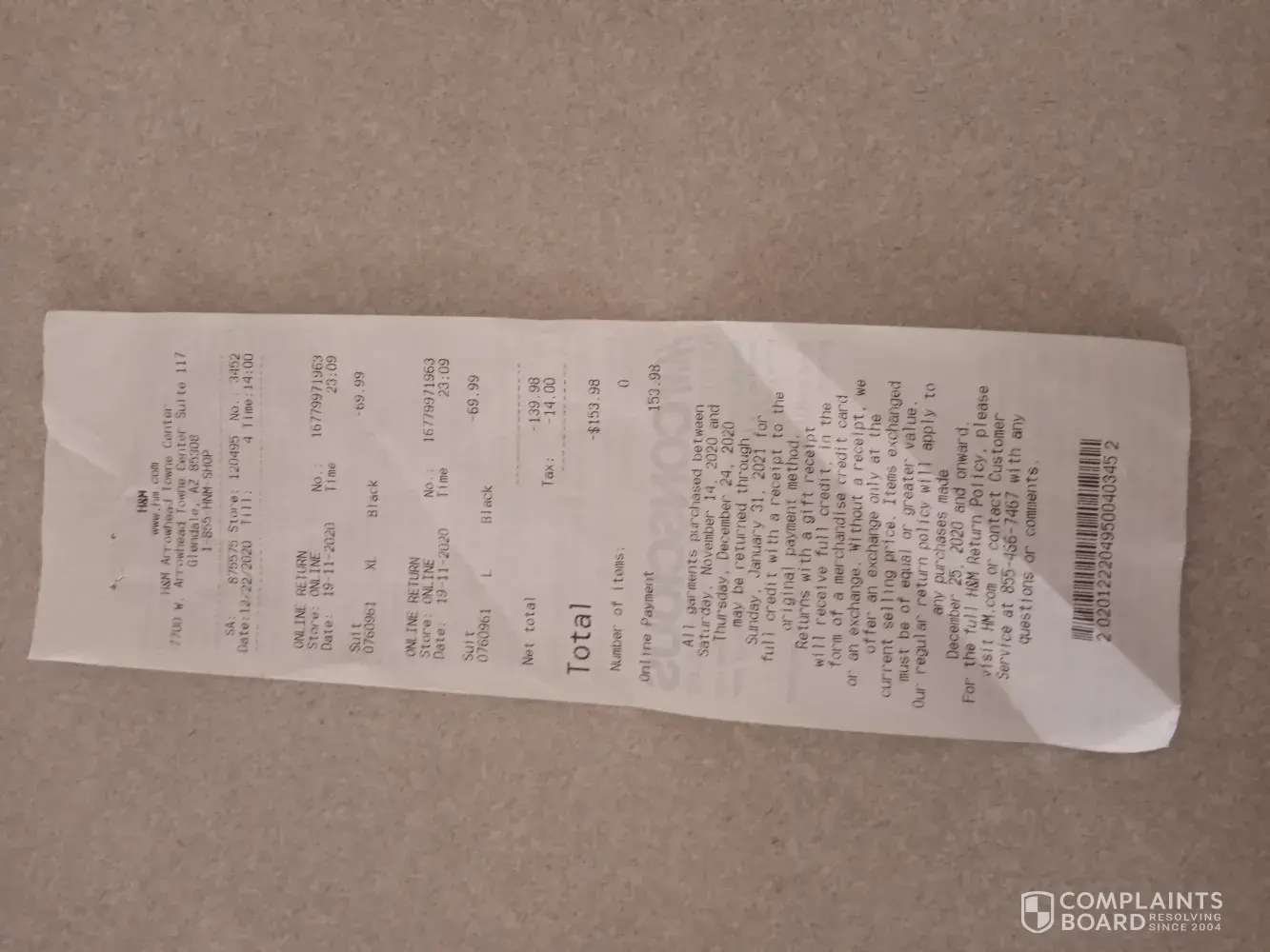 I ordered $153.98 worth of merchandise from h and m online on 11/19/20 and was charged on 11/26/20. I waited for a month to get the items, and when they arrived, they were of inferior quality so, instead for waiting for a credit by mail, I returned them to their store in glendale, az on 12/19/20. I received a credit slip and never had the amount credited to...