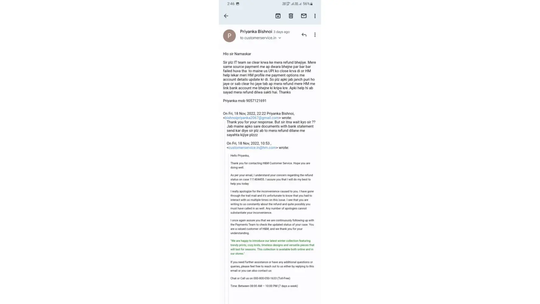 I shopped for Rs 23997 on h&m shopping site on 10th October 2022 but due to size issue I canceled the order on the same day my order number is [protected]. hm shopping site sent my refund to my account in next 24 hours but payment failed due to my UPI ID being locked and amount not deposited on which I talked to h&m shopping site then h&m shopping site gave me a UTR number [protected] Make it available I spoke to the bank regarding that UTR number but the bank clearly refused that no money has been deposited in the account from this UTR number then I again spoke to the h&m shopping site they checked and told that your payment failed Due to the deposit not being made you can be sure your funds are safe. I told hm care about my UPI being locked then asked to add an account number on h&m payment option, I did that too but my refund is yet to come. Please help me and send my refund as soon as possible to my account maintained in H&M payment option