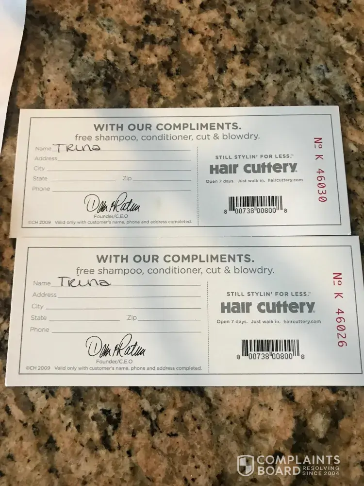 I asked to speak to a manager and she allowed us to use the coupon at no additional charge, however, the damage was already done. I reached to the district manger for this hair cuttery and she sent me an apologetic letter along with two more coupons for the same service which is not compensation for the lifelong damage it has done. Seeking therapy for both me and my grand-daughter for we have been both been traumatized by the incident.