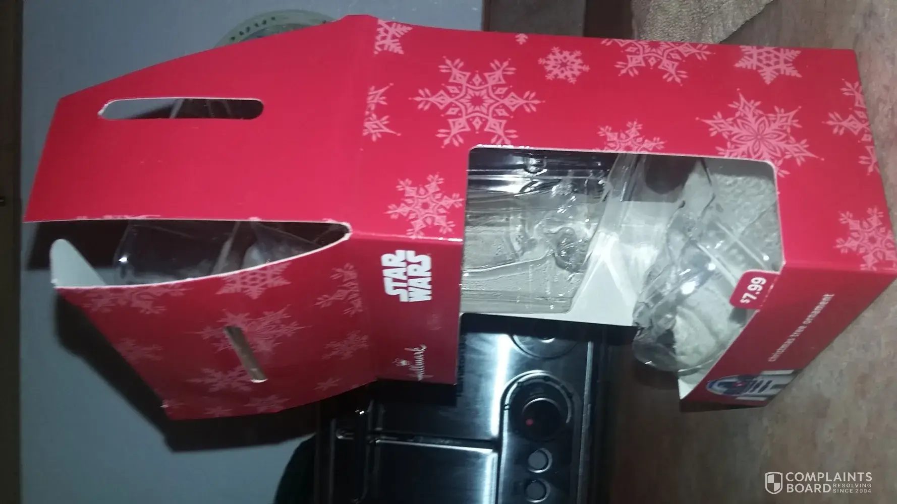 Let me say i love hallmark products and just wanted to let you know of a packaging problem. I purchased a new star wars r2d3 ornament, and as i pull the plasict holder out of the top of the box, it catches and ejects the ornament out the front, which causes it to brake. This slight miss hap but it need a wire tie or a front face cover to prevent this from happening.
