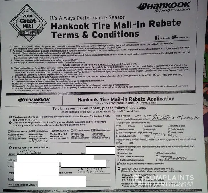 Thank you for choosing Hankook Tire and participating in the Mail-in Rebate Promotion.