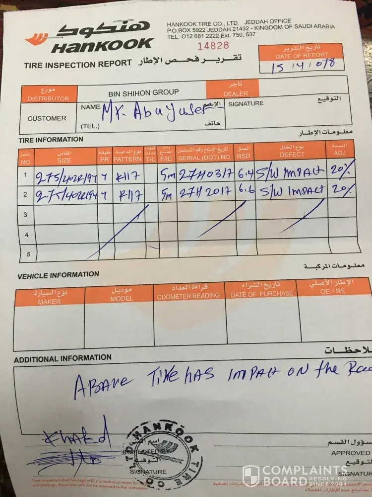 Report from hankook representatives in Riyadh copy follows. Not true and the one who checked is not professional. I am sure there is a manufacturer ‘s defect. Car has been driven normally under same existing circumstances and conditions.