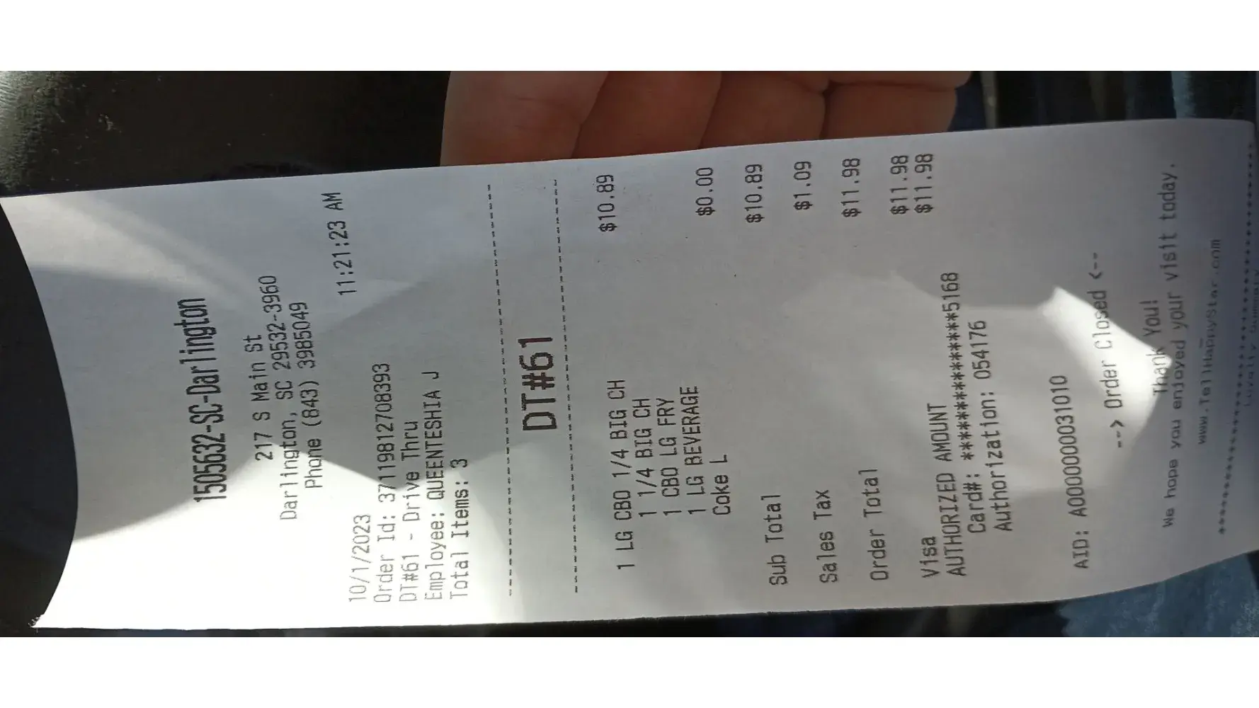 I went through the drive thru of Hardee's in Darlington, South Carolina, they were quick to take my order which is an improvement, but I ordered a big cheeseburger combo large got to the window paid for it and got my drink, waited there for about 2 minutes and was asked to pull up so the people behind me can pay, about a little over five minutes after that...