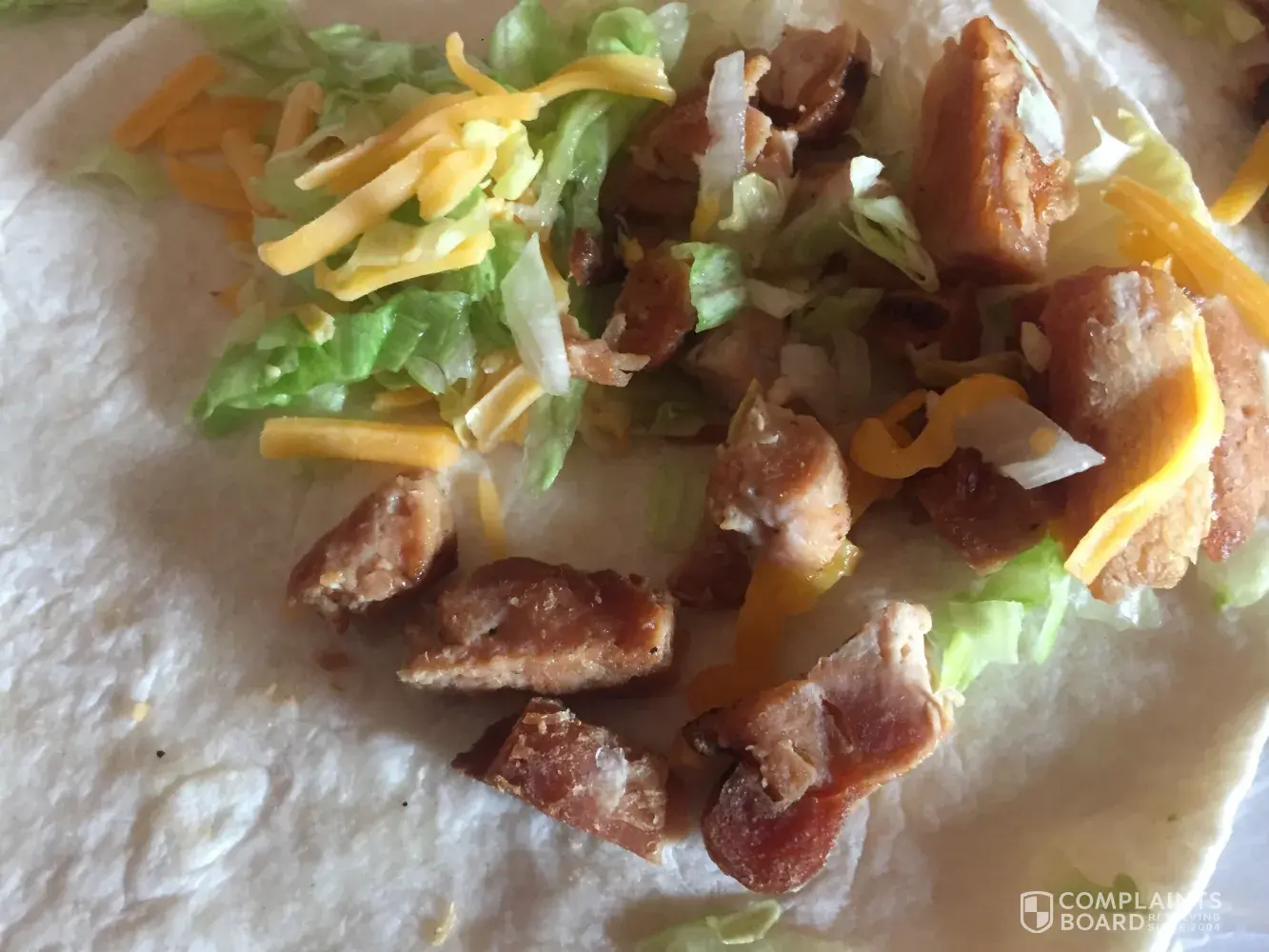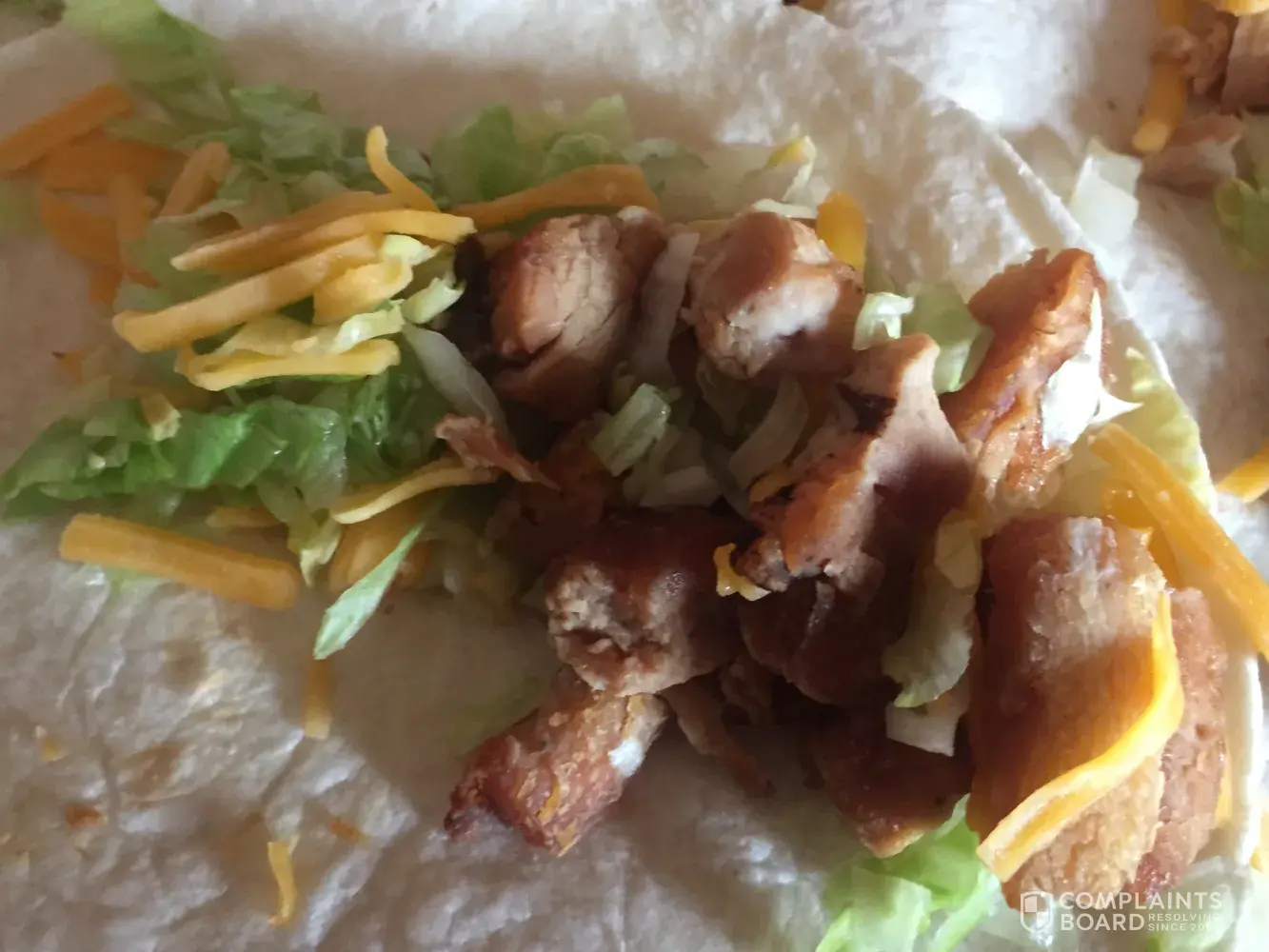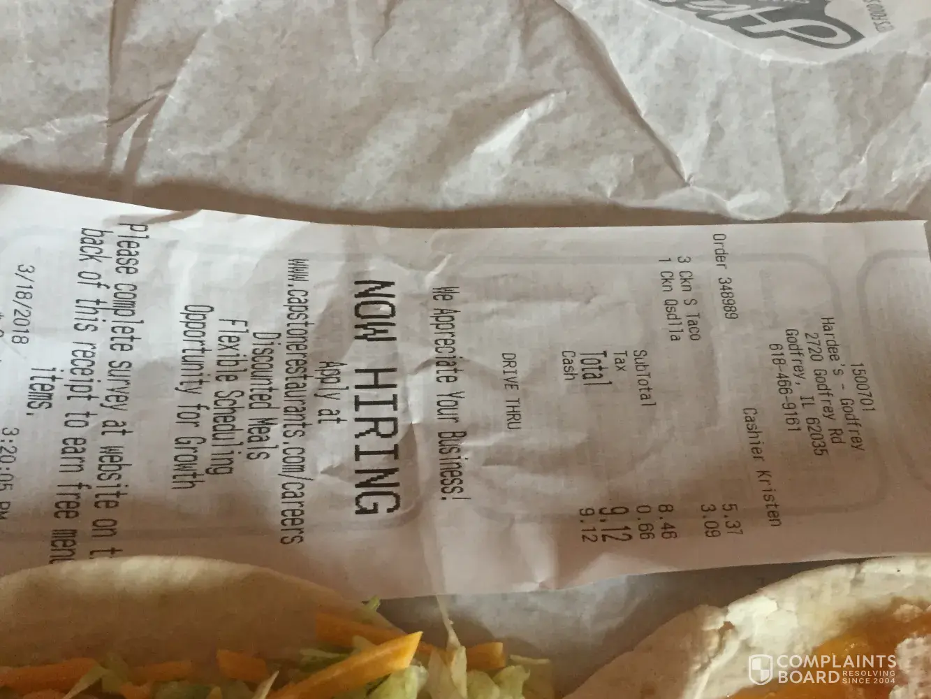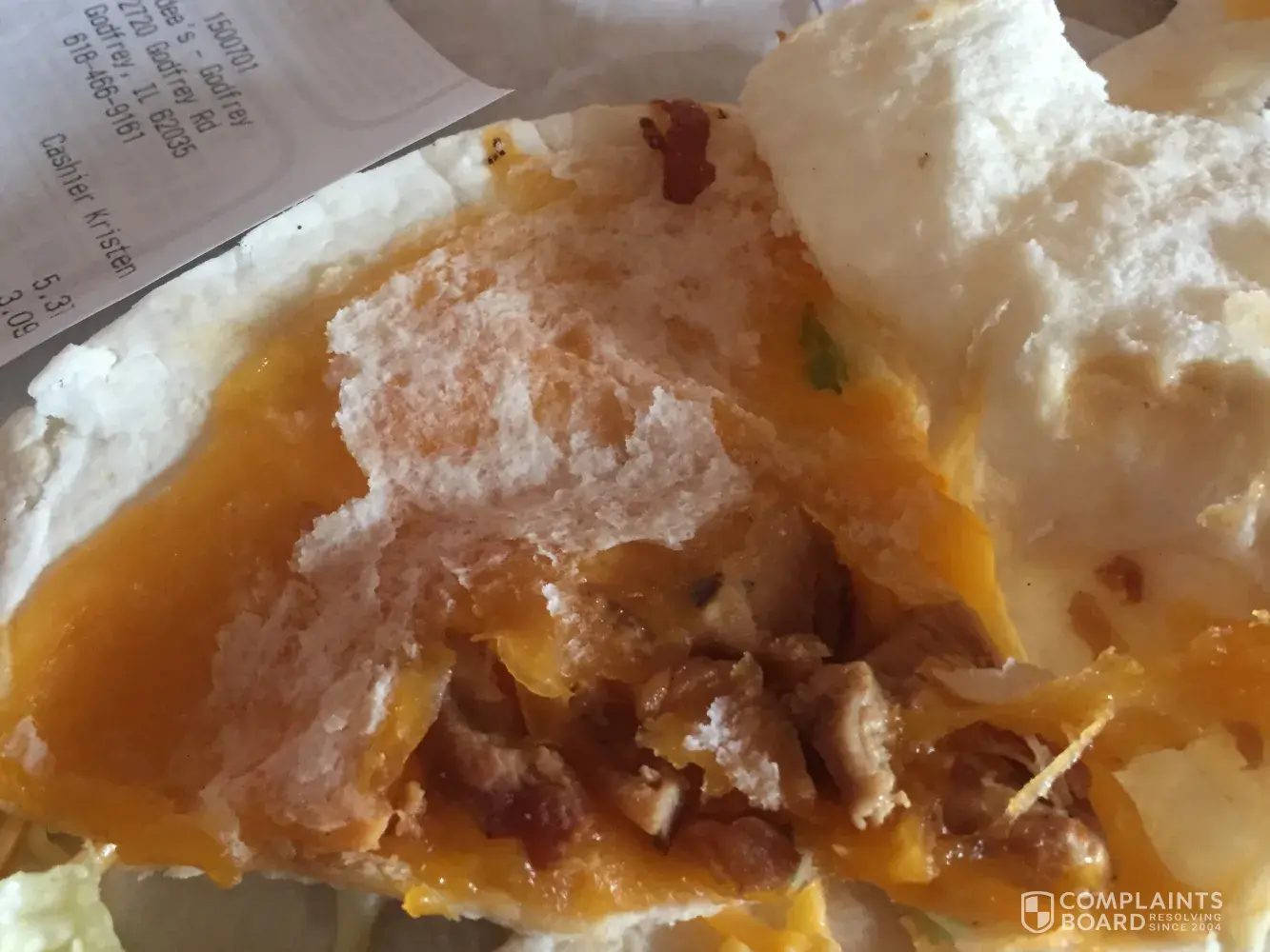 I went through the drive thru and ordered 3 chicken soft tacos and a chicken quesadilla. I waited almost 10 minutes in the drive thru expecting to have a fresh and hot meal. To my disappointment, I had 3 poorly made tacos with what looks like mystery meat due to the chicken being so old and dried out. A chicken quesadilla that had barely any chicken in it, that too included the extremely old and dried chicken. I frequently visit hardees for the chicken soft tacos, however, the past couple trips have been awful. The trip before this last one the chicken tacos had soggy taco shells and liquid draining from the taco. Obviously, I have had to throw out the past two orders. I will not visit the location again. I live in Grafton, IL which is 20 minutes from the location so I can not easily just go back for a refund or fresh food. I would like a refund of my purchase. Please contact me via email at: