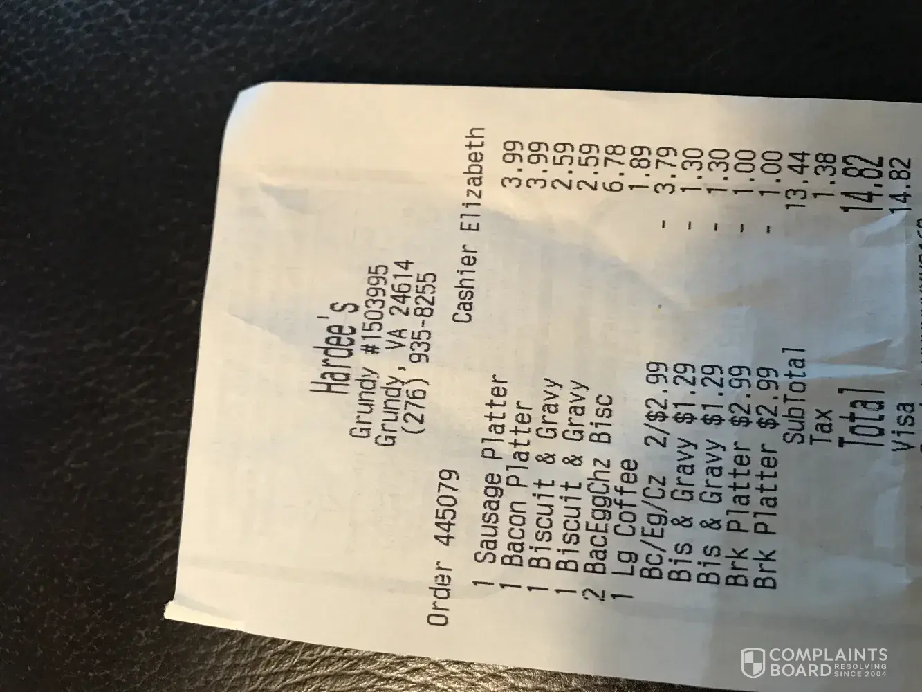Visited Hardee's in Grundy VA this morning..the girl at the window started getting my order together and realized they were out of hash browns...she threw my tray of food across the counter and when she realized I saw her she asked if I needed any jelly...I told her yes...she made me pull over to the side of the parking lot and waited for 15 minutes then...