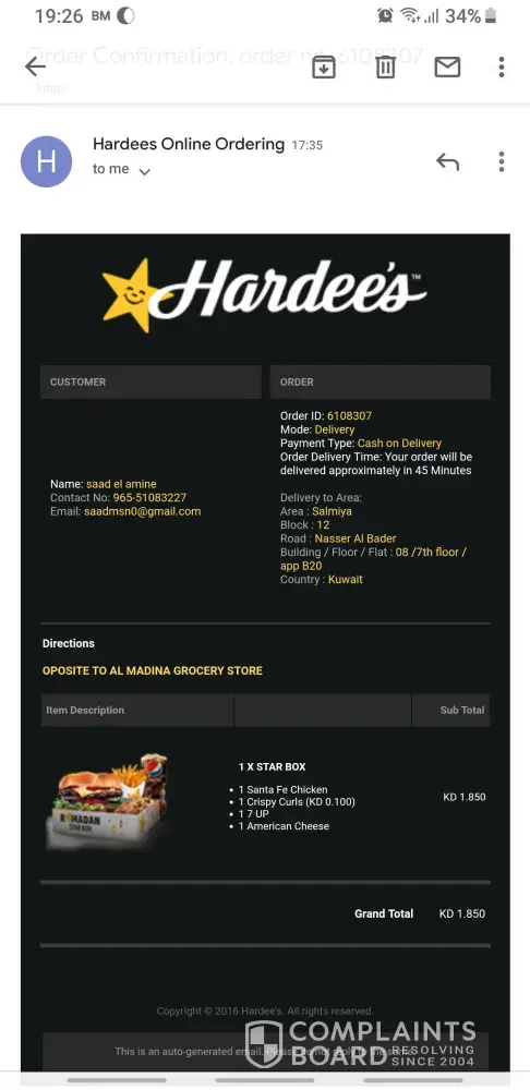 My name is Ahmad Yousef. I ordered food from hardee's Kuwait today 28/4/2019 on 7:00pm by the hardee's Kuwait website and they mentioned that it will arrive to my place within 60 mins and it took more than 80 mins. I wish that hardee's original company in the states receive my complaint and fix things like this in Kuwait because that will damage and make a bad influence on hardee's name.