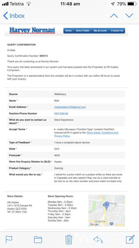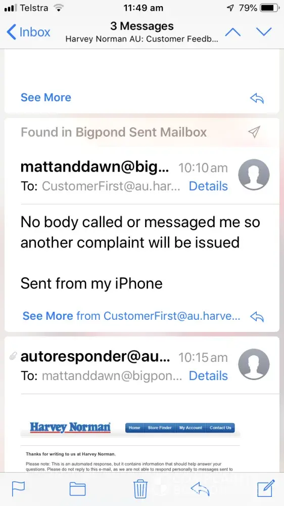 Furthermore, I am being inconvenienced by waiting around for useless delivery men to pick up your stock at a time(s) convenient for them and Harvey Norman. I have had to rush home early from work to ensure I can allow access to my home so they can obtain the items, instead you have inconvenience by keeping the items at my premises, asking me to be responsible for them on the store's behalf and wasting my time and work time.
