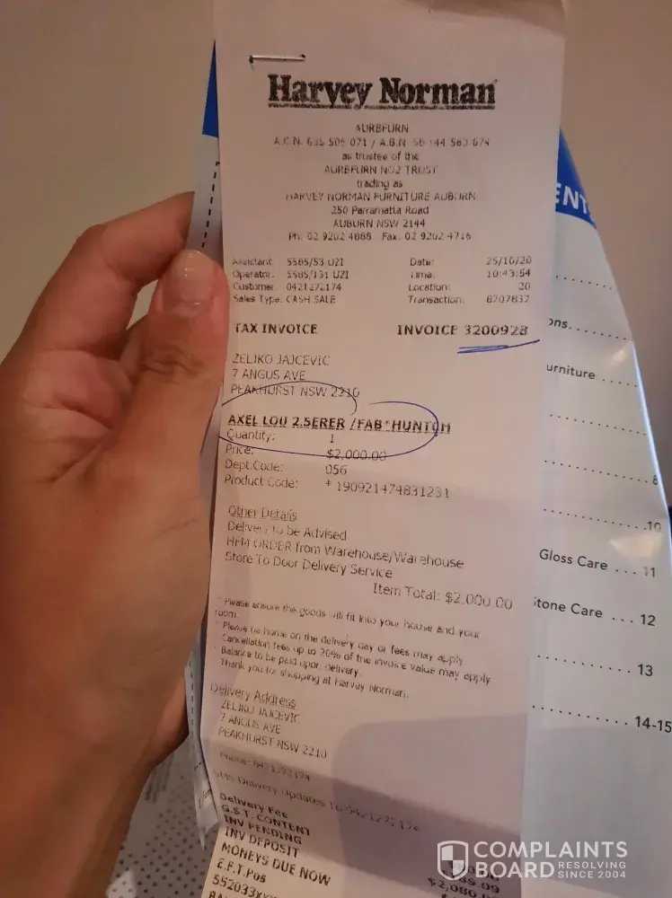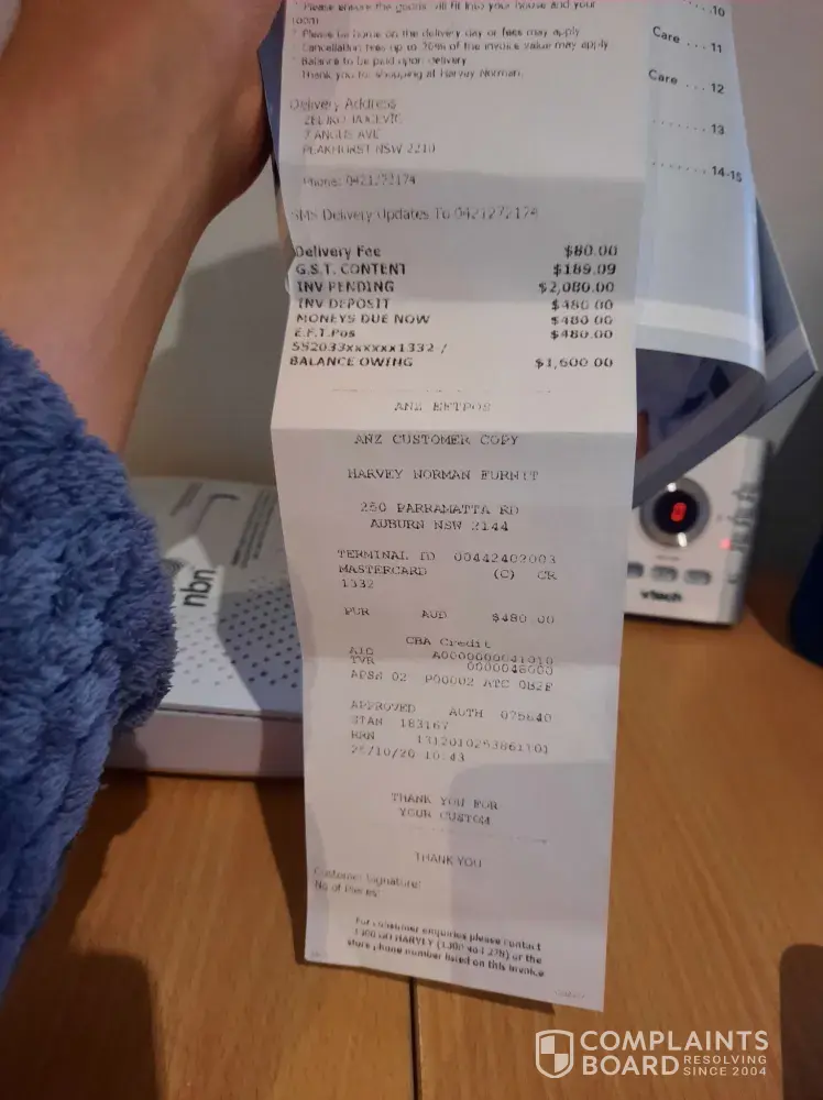 We ordered a couch from Harvey Norman Auburn store over 6 months ago (25/10/2020). As seen on the receipt (attached), we have paid a deposit of $480.00 plus delivery of $80.00 to receive the product. We have NOT received this product 6 months later and apparently still waiting with no idea when it'll be delivered.